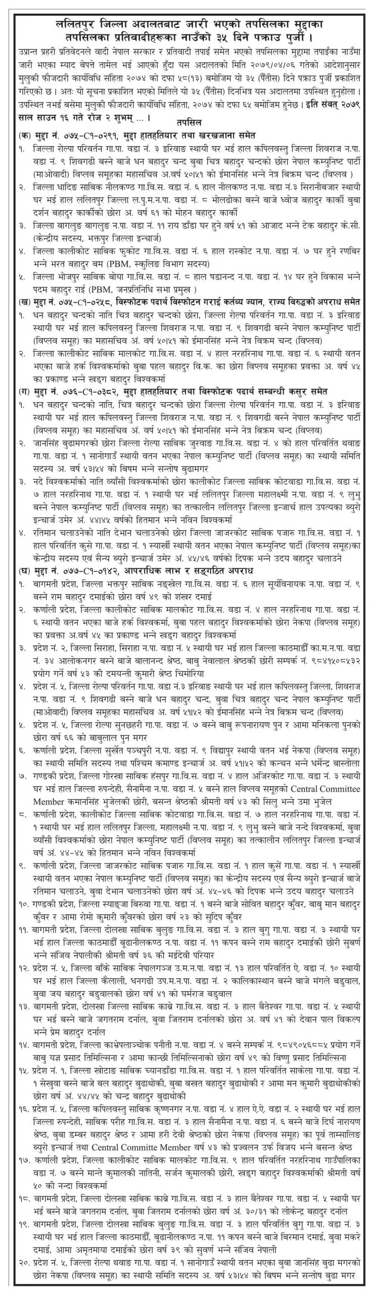 उनीहरूमाथि लागेका यी मुद्दाहरूमा म्याद बेपत्ते तामेल भएकाले २०७९ साउन ६ गतेको आदेशअनुसार मुलुकी फौजदारी कार्यविधि संहिता २०७४ को दफा ५८ को १३ अनुसार ३५ दिने पक्राउ पुर्जी जारी गरिएको ललितपुर जिल्ला अदालतले जनाएको छ।