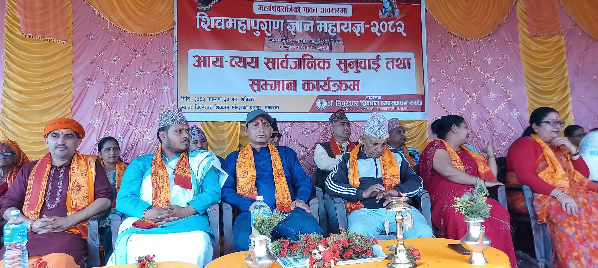 सुनवल।पश्चिम नवलपरासीको सुनवल-१३ सुर्यवस्तीमा सञ्चालित शिव महापुराण ज्ञान महायज्ञको आय-व्यय विवरण सार्वजनिक गरिएको छ।त्रिपुरेश्वर शिवधाम व्यवस्थापन संस्थाको आयोजनामा महायज्ञबाट संकलित रकमको विवरण सार्वजनिक गरिएको हो। १०८ शिवलिङ्ग स्थापना तथा ज्येष्ठ नागरिक सत्संग भवन निर्माणार्थ गत गत माघ २३ गतेदेखि फागुन ४ गतेसम्म सञ्चालन भएको महायज्ञमा ४८ लाख ९५ हजार रुपैयाँ...