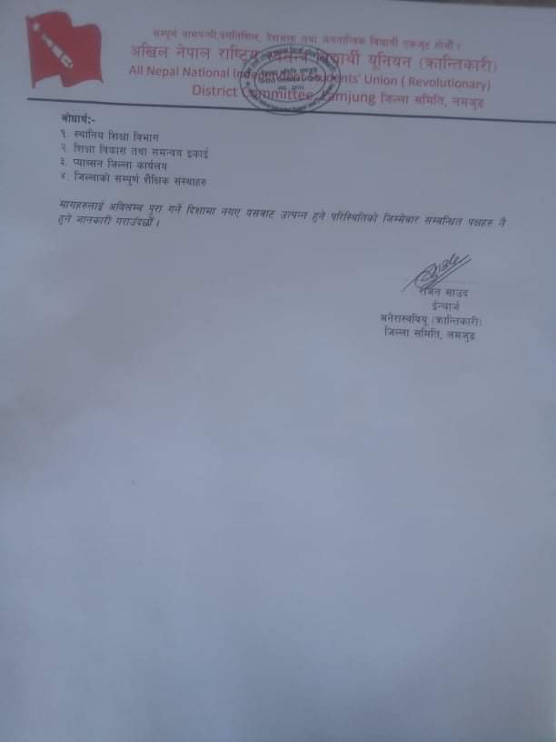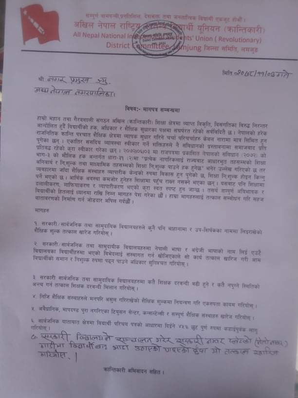 लमजुङ्ग।नेकपा निकट बिधार्थी संगठन अखिल (क्रान्तिकारी) लमजुङ्गले मध्य नेपाल नगरपालिका लाइ ७ बुद्दे माग पत्र बुझाएको छ