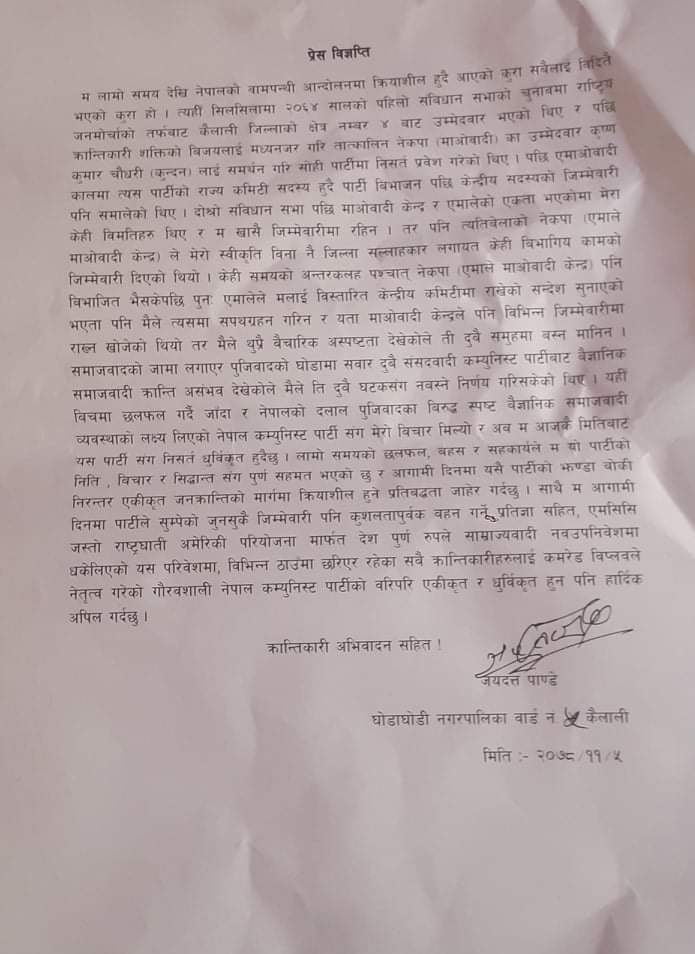 मनोज रावत,फाल्गुन ५ कैलाली।कैलाली जिल्लाको घोडाघोडी नगरपालिका ५ का कम्युनिस्ट आन्दोलनका पुराना र प्रभावशाली नेता जयदत्त पाण्डे नेत्रविक्रम चन्द नेतृत्वको नेपाल कम्युनिस्ट पार्टीमा ध्रुविकृत भएका छन। बिहिबार उनले एक प्रेस बिज्ञप्ति जारी गर्दै आफु नेकपामा ध्रुविकृत भएको जानकारी दिएका हुन।