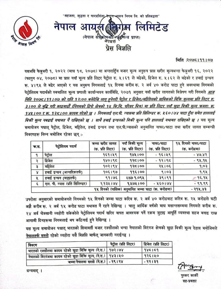 यस्तै, निगमले खाना पकाउने एलपी ग्यास र हवाई इन्धनको मूल्य भने यथावत राखेको छ । मूल्य समायोजनपश्चात् पनि निगमलाई १५ दिनमा २ अर्ब १५ करोड रुपैयाँ घाटा हुने जनाएको छ ।