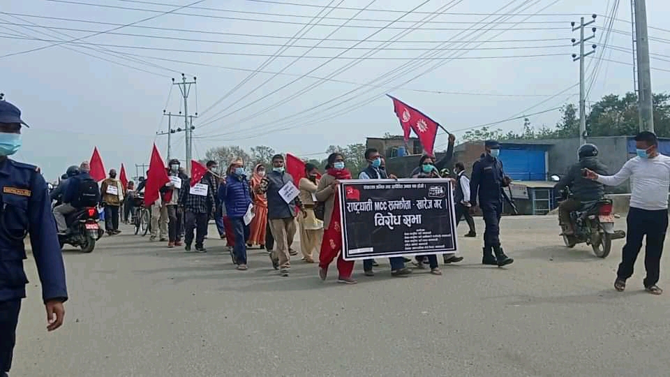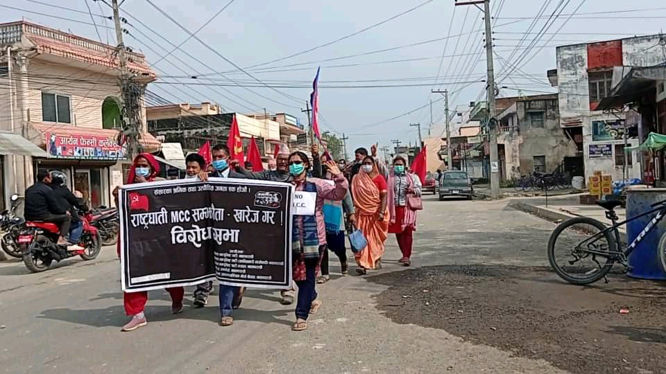 फागुन १२,परासी। विप्लव नेतृत्वको नेपाल कम्युनिस्ट पार्टी सहित सयुक्त मोर्चाले जिल्ला प्रशासन कार्यलय नवलपरासी घेराउ गरेका छन। संयुक्तमोर्चाले एमसिसिको खारेजी माग गर्दै र्‍याली सहित प्रशासन कार्यलय घेराउ गरेका हुन। र्‍यालीमा एमसिसी खारेज गर,पेट्रोलियम पदार्थको मुल्य वृद्धि खारेज गर,अमेरिकी साम्राज्यवाद मुर्दावाद जस्ता नारा लगाएका थिए। एमसीसी मुर्दावाद देश बेच्न पाइदैन एमसीसी चाहिदैन जस्ता नारासहित रामग्राम-४ हाटबजारबाट निकालिएको र्‍याली प्रशासन कार्यलयमा पुगेर कोणसभामा परिणत भएको हो ।