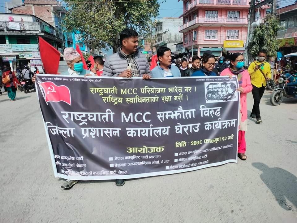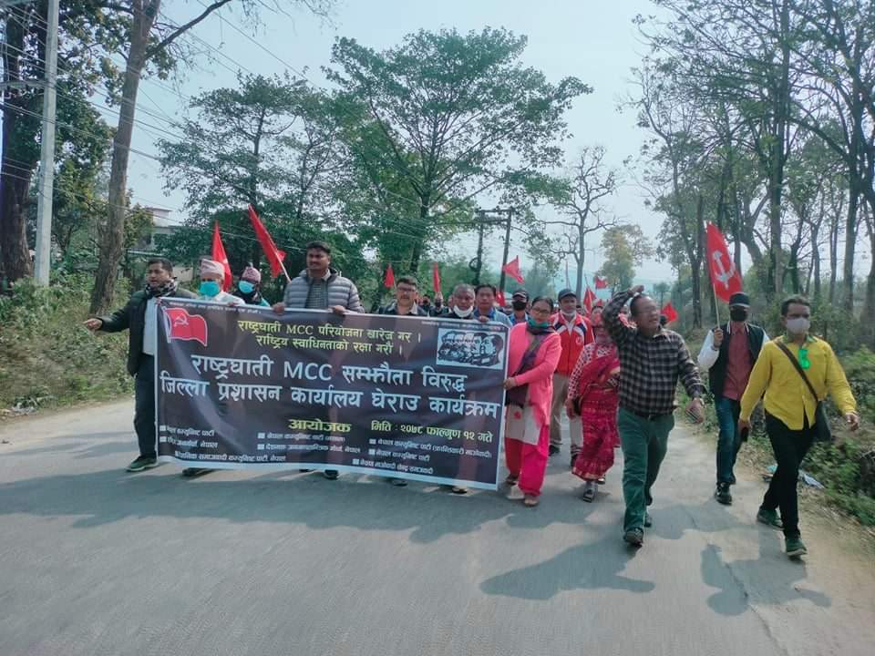 नेपाल कम्युनिस्ट पार्टी लगायत ६ दलिय मोर्चाद्वारा उदयपुरको सदरमुकाम गाईघाटको पिपल चौक बाट नारा लगाउदै बजार परिक्रमा गरि जिल्ला प्रशासन कार्यालय उदयपुर घेराउ कार्यक्रम सम्पन्न गरेको हो । जिल्ला प्रशासन घेराउ कार्यक्रमलाई सम्बोधन गर्दै नेपाल कम्युनिस्ट पार्टीका केन्द्रिय सदस्य तथा उदयपुर ओखलढुंगा ईन्चार्ज बिबेक कुमालले राष्ट्रघाती एमसीसि देशका संसदवादी दलालहरुले आफ्नो देशको राष्ट्रियता अमेरिकालाई बेच्ने कुचेष्टा गरिरहेको बताउँदै आफ्नो पार्टीले यो एमसिसि सम्झौता खारेज नगर्दा सम्म निरन्तर संघर्स गर्ने बताए, आजसम्म देशमा जति पनि राष्ट्रघाती सम्झौताहरु गरिएका छन् त्यो सबै कांग्रेसको नै अग्रसरता रहेको आरोप लगाएका छ्न। यो रास्ट्रघाती एमसिसि कुनै हालतमा लागू हुन नदिने उनले बताए ।