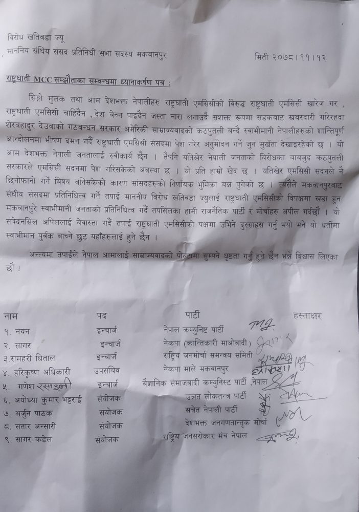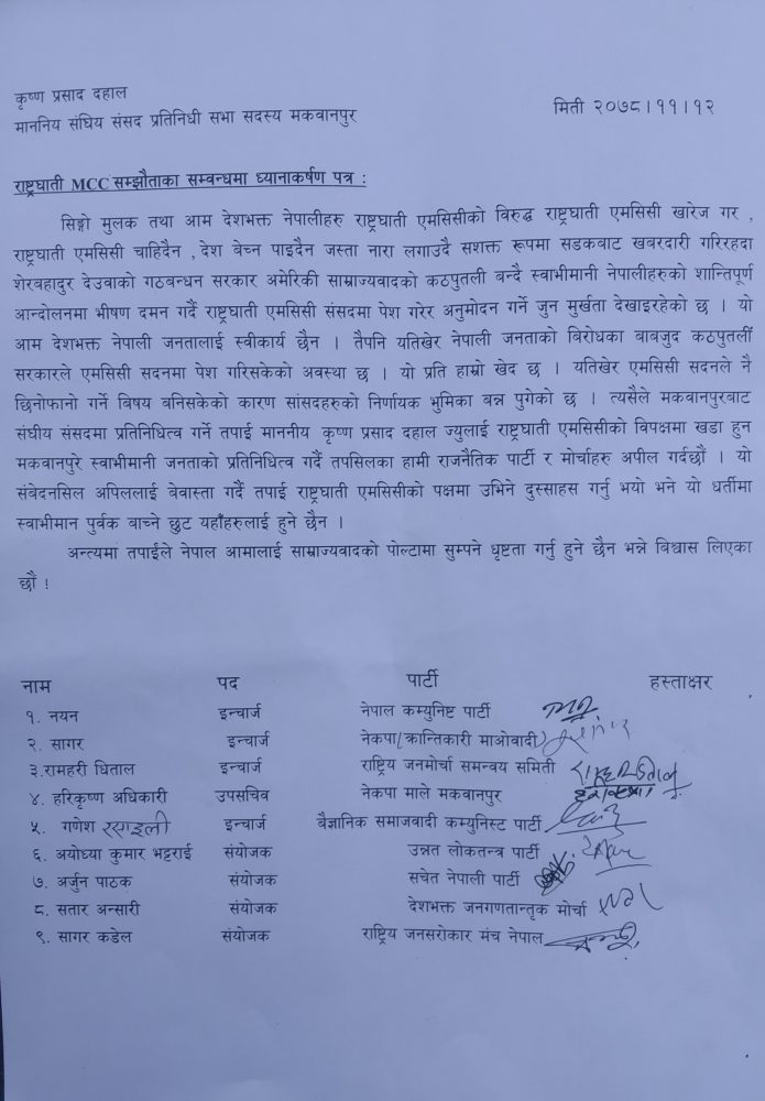 पत्रमा सिँगो मुलुक तथा आम देशभक्त नेपालीहरु राष्ट्रघाती एमसिसीको विरुद्ध राष्ट्रघाती एमसिसी खारेज गर, राष्ट्रघाती एमसिसी चाहिँदैन, देश बेच्न पाइँदैन जस्ता नारा लगाउँदै सशक्त रुपमा सडकबाट खबरदारी गरिरहँदा शेर बहादुर देउवाको गठबन्धन सरकार अमेरिकी साम्राज्यवादको कठपुतली बन्दै स्वाभिमानी नेपालीहरुको शान्तिपूर्ण आन्दोलनमा भीषण दमन गर्दै राष्ट्रघाती एमसिसी एम सिसी संसदमा पेश गरेर अनुमोदन गर्ने जुन मूर्खता देखाइरहेको छ। यो आम देशभक्त नेपाली जनतालाई स्वीकार्य छैन। तैपनि यतिखेर नेपाली जनताको विरोधका बावजूद कठपुतली सरकारले एमसिसी सदनमा पेश गरिसकेको छ। यो प्रति हाम्रो खेद छ भन्ने कुरा उल्लेख गरेको छ। यतिखेर एम सिसी सदनले नै छिनोफानो गर्ने विषय बनिसकेको कारण सांसदहरुको निर्णायक भूमिका बन्न पुगेकोले मकवानपुरबाट संघीय संसदमा प्रतिनिधित्व गर्ने माननीय विरोध खतिवडा र कृष्ण प्रसाद दाहाललाई राष्ट्रघाती एम सिसीको विपक्षमा खडा हुन मकवानपुरे स्वाभिमानी जनताको प्रतिनिधित्व गर्दै विभिन्न ६ राजनीतिक पार्टीे, दुई मोर्चा र एक मञ्चले संयुक्त रुपमा पत्र मार्फत अपिल गरेको छ।