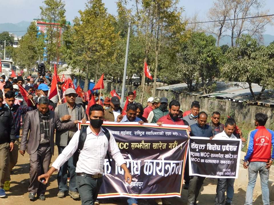 नेकपा सहितका दल र मोर्चा द्वारा mcc खारेजको माग गर्दै देशैभरि विरोध प्रदर्शनका गर्दै आएको छ र आज पनि देअभरका प्रशासन कार्यालय घेराऊ सहित जनसभा सम्पन्न गरेको छन ।
