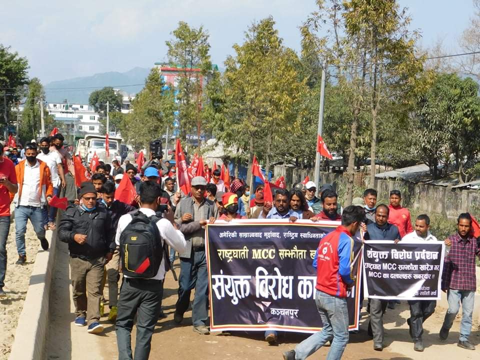 महेन्द्रनगर खुलामञ्च बाट सुरु भएको र्याली एम सी सी खारेज गर, दलाल हरु मुर्दाबाद जस्ता नारा लगाउँदै प्रशासन घेराउ गरेको थियो र संविधान चोकमा कोण सभामा परिणत भएको थियो ।