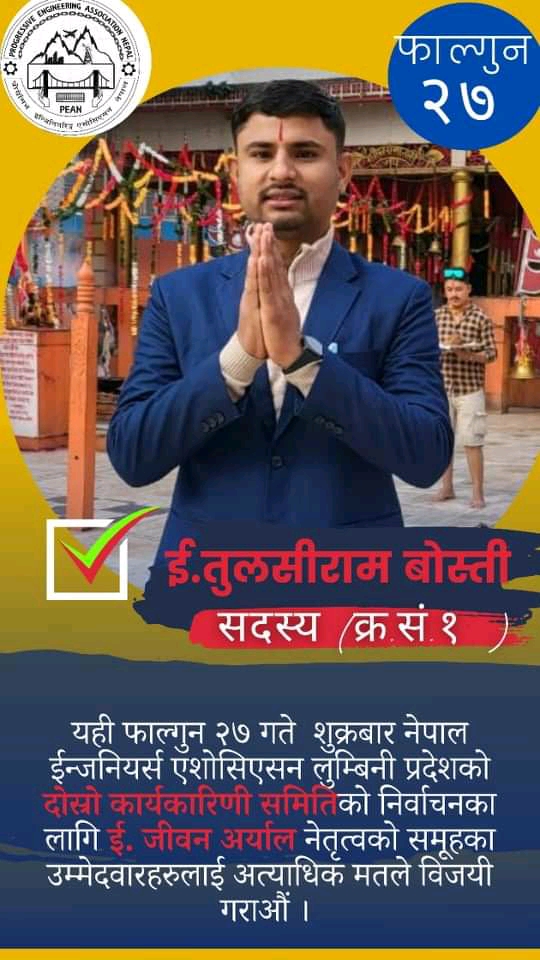 अग्रजलाइ सम्मान र नविललाई माया , सामजिक काममा निरन्तर लागि पर्ने इन्जिनियर तुलसीराम वोस्ती नेपाल इन्जिनियरस एसोसिएसन लुम्बिनी प्रदेश कार्यसमितिको सदस्य क्र.म संख्या १पदका उमेदवार बनेका छन ।