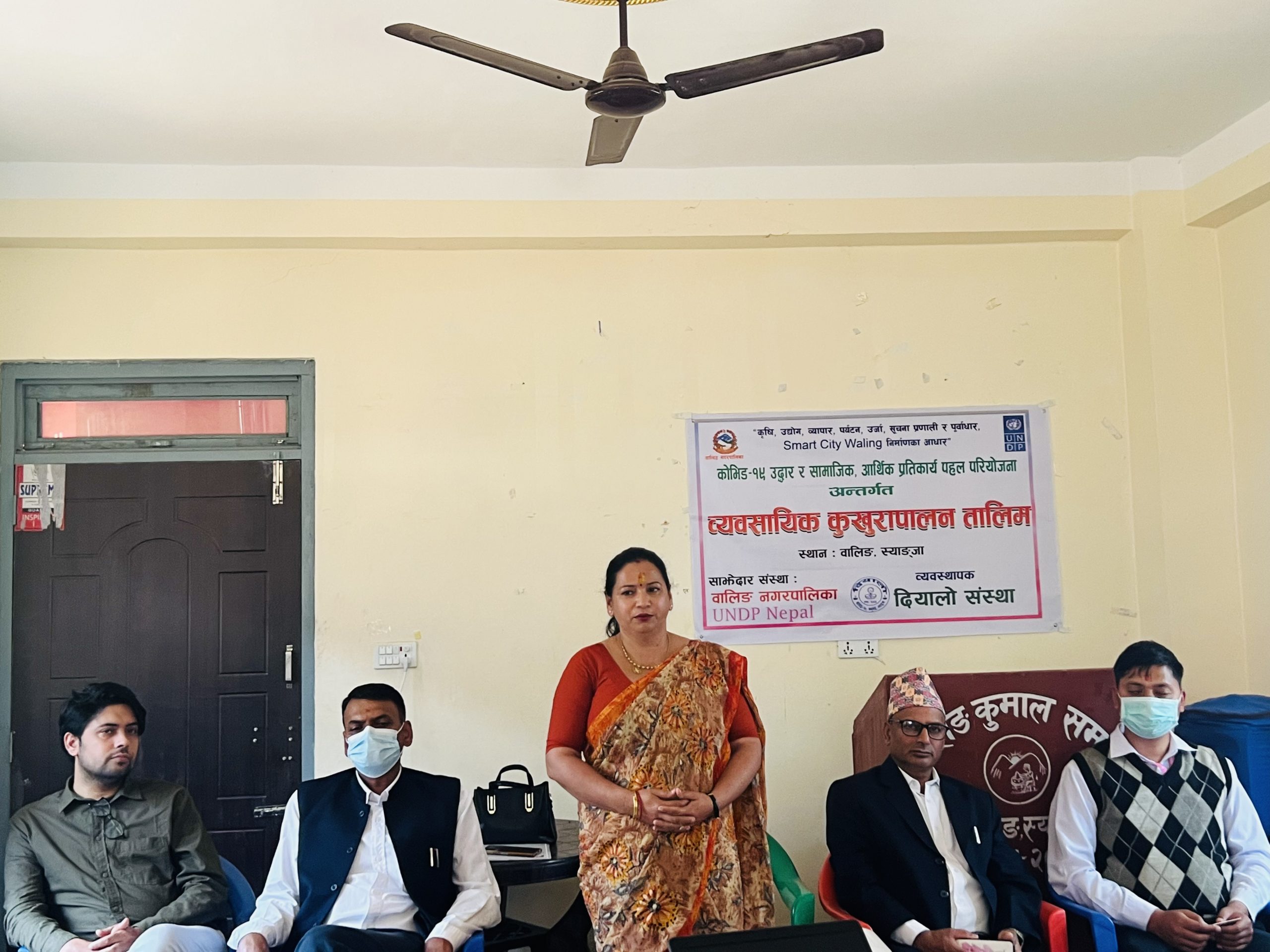 वालिङ नगरपालिका र युएनडिपी नेपालको साझेदारी तथा दियालो सस्थाको व्यवस्थापनमा वालिङमा“कोभिड १९ उद्धार र सामाजिक आर्थिक प्रतिकार्य पहल परियोजना’अन्तर्गत व्यवशायीक कुखुरा पालन सम्बन्धी ३ दिने तालिम सुरु भएको हो ।