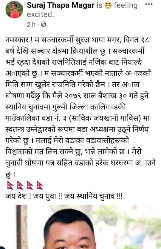 नमस्कार ! म सञ्चारकर्मी सुरज थापा मगर, विगत १८ बर्ष देखि सञ्चार क्षेत्रमा क्रियाशील छु । सञ्चारकर्मी भई रहदा देशकाे राजनितिलाई नजिक बाट नियाल्दै अाएकाे छु । म सञ्चारकर्मी भएकाे नाताले अाजकाे मिति सम्म खुलेर राजनिति गरेकाे छैन । तर अाज घाेषणा गर्दैछु कि मैले २०७९ साल बैशाख ३० गते हुने स्थानिय चुनावमा गुल्मी जिल्ला कालिगण्डकी गाउँकालिका वडा नं. ३ (साविक जयखानी गाविस) मा स्वतन्त्र उम्मेद्वारकाे रूपमा वडा अध्यक्षमा उठ्ने निर्णय गरेकाे छु । मलाई मेराे वडाका वडावासीहरूकाे विश्वासकाे मत लिन सक्ने छु, भन्ने लागेकाे छ । मेराे चुनावी घाेषणा पत्र सहित वडाकाे हरेक घरघरमा अाउने छु ।