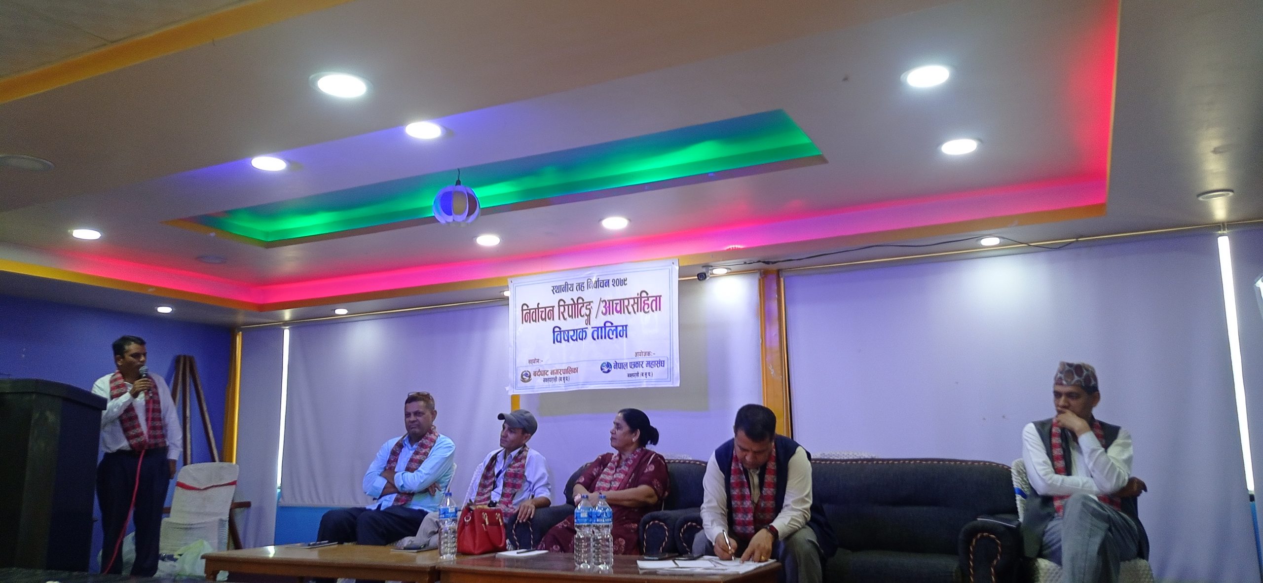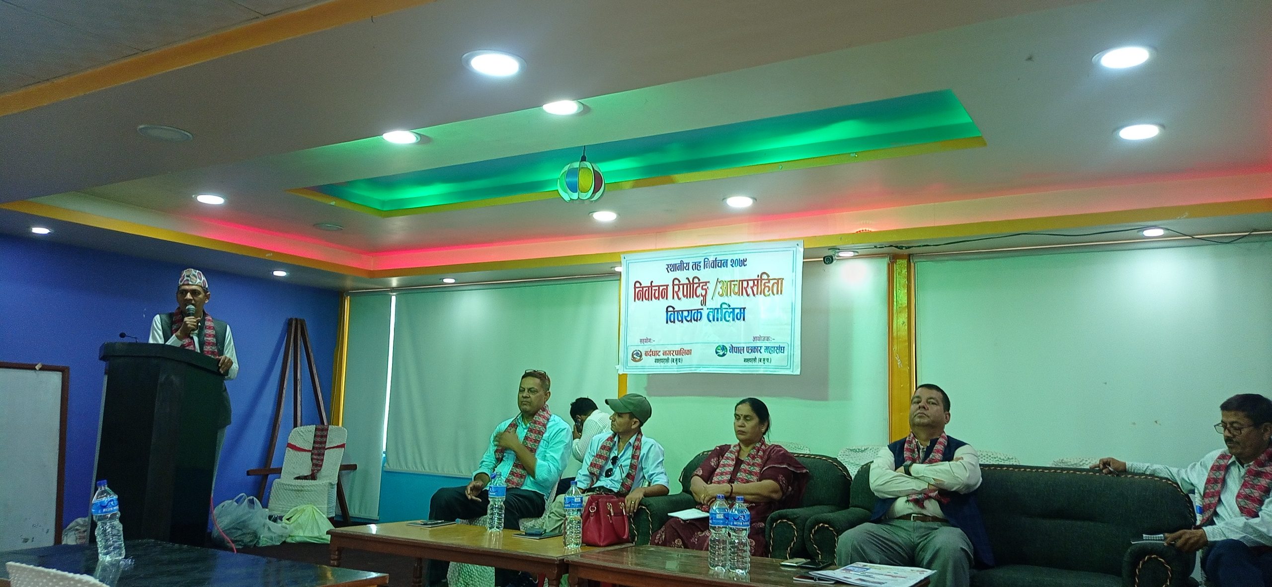 तालिममा निर्वाचनमा कसरी रिर्पोटिङ गर्ने र पत्रकारहरुले निर्वाचनमा गर्नुपर्ने भुमिकाका बारेमा प्रशिक्षक पत्रकार एवं शेर बहादुर केसीले प्रशिक्षण दिनुभएको थियो।