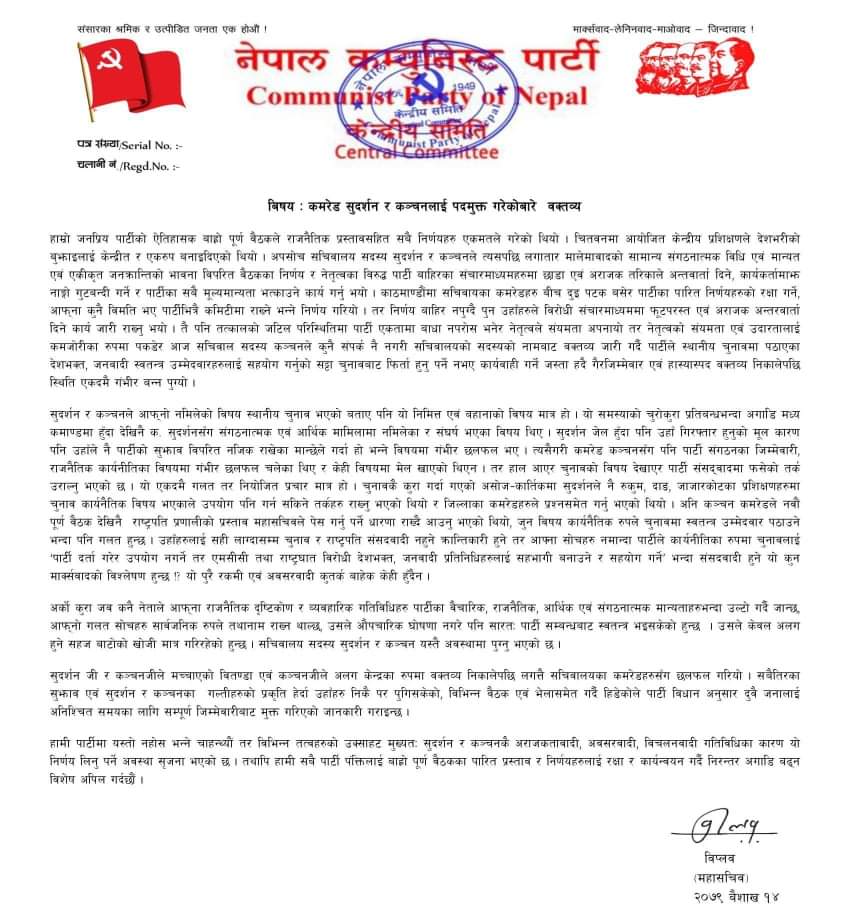 काठमाडौ।नेपाल कम्युनिस्ट पार्टीले सचिवालय सदस्य सुदर्शन र कञ्चनलाई पदमुक्त गरेको छ। सो पार्टीका महासचिव विप्लवले बुधबार एक बिज्ञप्ति जारी गर्दै सो जानकारी दिएका हुन्।