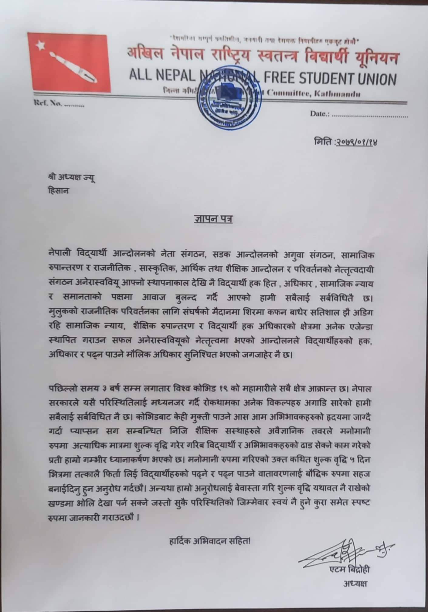 पछिल्लो समय ३ बर्ष सम्म लगातार विश्व कोभिड १९ को महामारीले सबै क्षेत्र आक्रान्त छ। नेपाल सरकारले यसै परिस्थितिलाई मध्यनजर गर्दै रोकथामका अनेक विकल्पहरु अगाडि सारेको हामी सबैलाई सर्बविधित नै छ। कोभिडबाट केही मुक्ती पाउने आस आम अभिभावकहरुको हृदयमा जाग्दै गर्दा प्याप्सन सग सम्बन्धित निजि शैक्षिक सस्थाहरुले अवैज्ञानिक तवरले मनोमानी रुपमा अत्याधिक मात्रमा शुल्क वृद्धि गरेर गरिब विद्यार्थी र अभिभावकहरुको ढाड सेक्ने काम गरेको प्रती हाम्रो गम्भीर ध्यानाकर्षण भएको छ। मनोमानी रुपमा गरिएको उक्त कथित शुल्क वृद्धि ५ दिन भित्रमा तत्कालै फिर्ता लिई विद्यार्थीहरुको पढ्ने र पढ्न पाउने वातावरणलाई बौद्धिक रुपमा सहज बनाईदिनु हुन अनुरोध गर्दछौ। अन्यथा हाम्रो अनुरोधलाई बेवास्ता गरि शुल्क वृद्धि यथावत नै राखेको खण्डमा भोलि देखा पर्न सक्ने जस्तो सुकै परिस्थितिको जिम्मेवार स्वयं नै हुने कुरा समेत स्पष्ट रुपमा जानकारी गराउदछौ ।