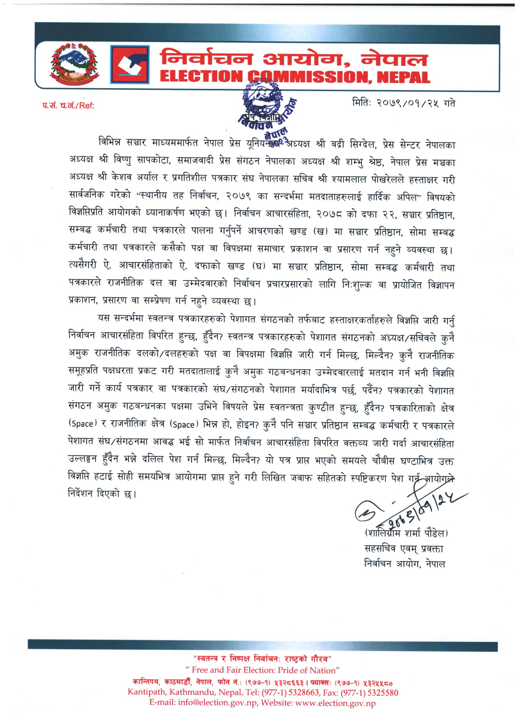ती पत्रकार संगठनले आसन्न स्थानीय तहकाे निर्वाचनमा नेकपा एमालेलाई हराउँदै गठबनेधनमा रहेका दललाई विजयी गराउन आह्वानसहित संयुक्त वक्तव्य जारी गरेका थिए। यसबारे निर्वाचन आयोगले २४ घण्टे लिखित स्पष्टीकरण मागेको हो।