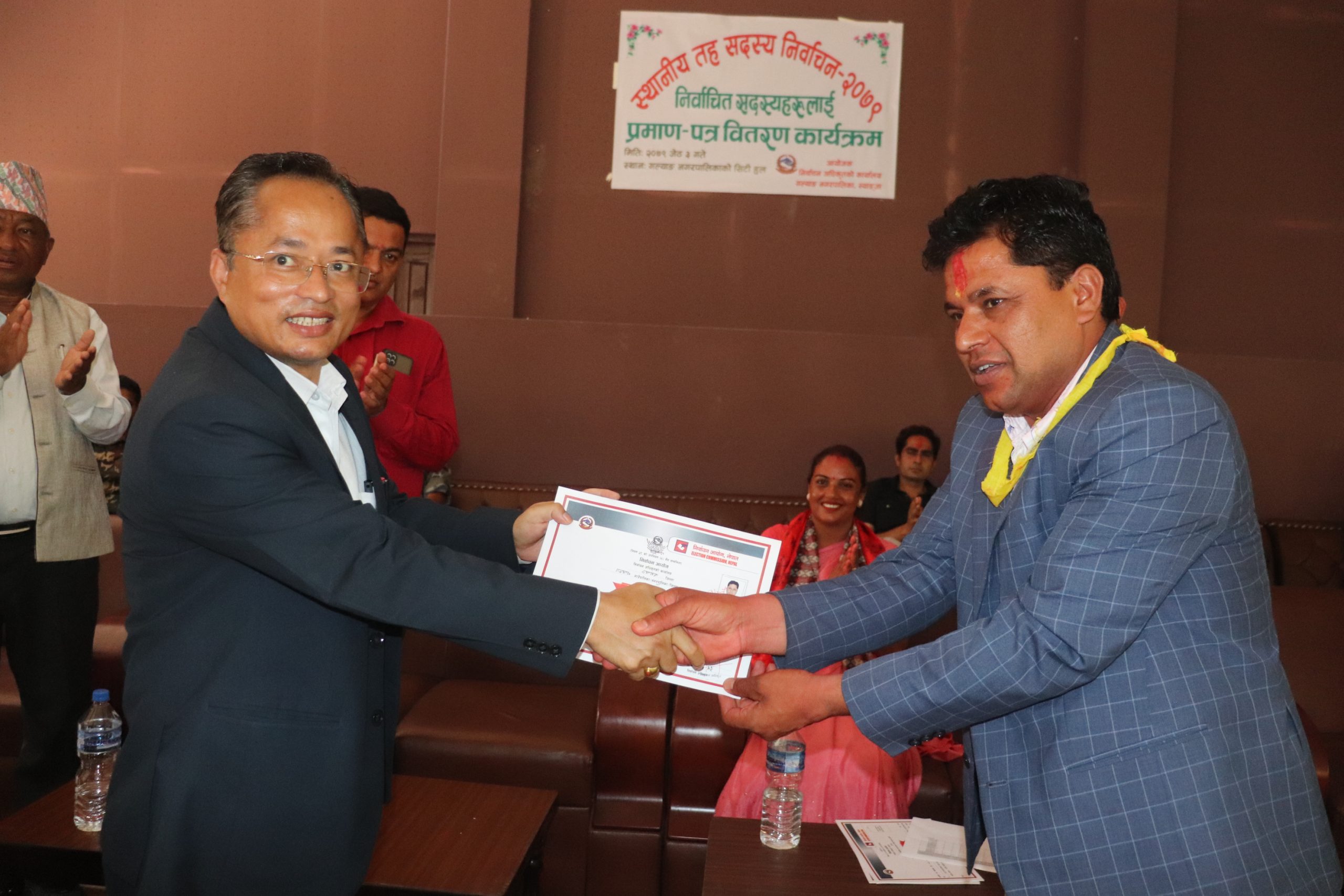 स्थानीय तह सदस्य निर्वाचनको मतगणना हिजो सकिएपछि नवनिर्वाचित जनप्रतिनिधिलाई आज प्रमाणपत्र वितरण गरिएको हो।