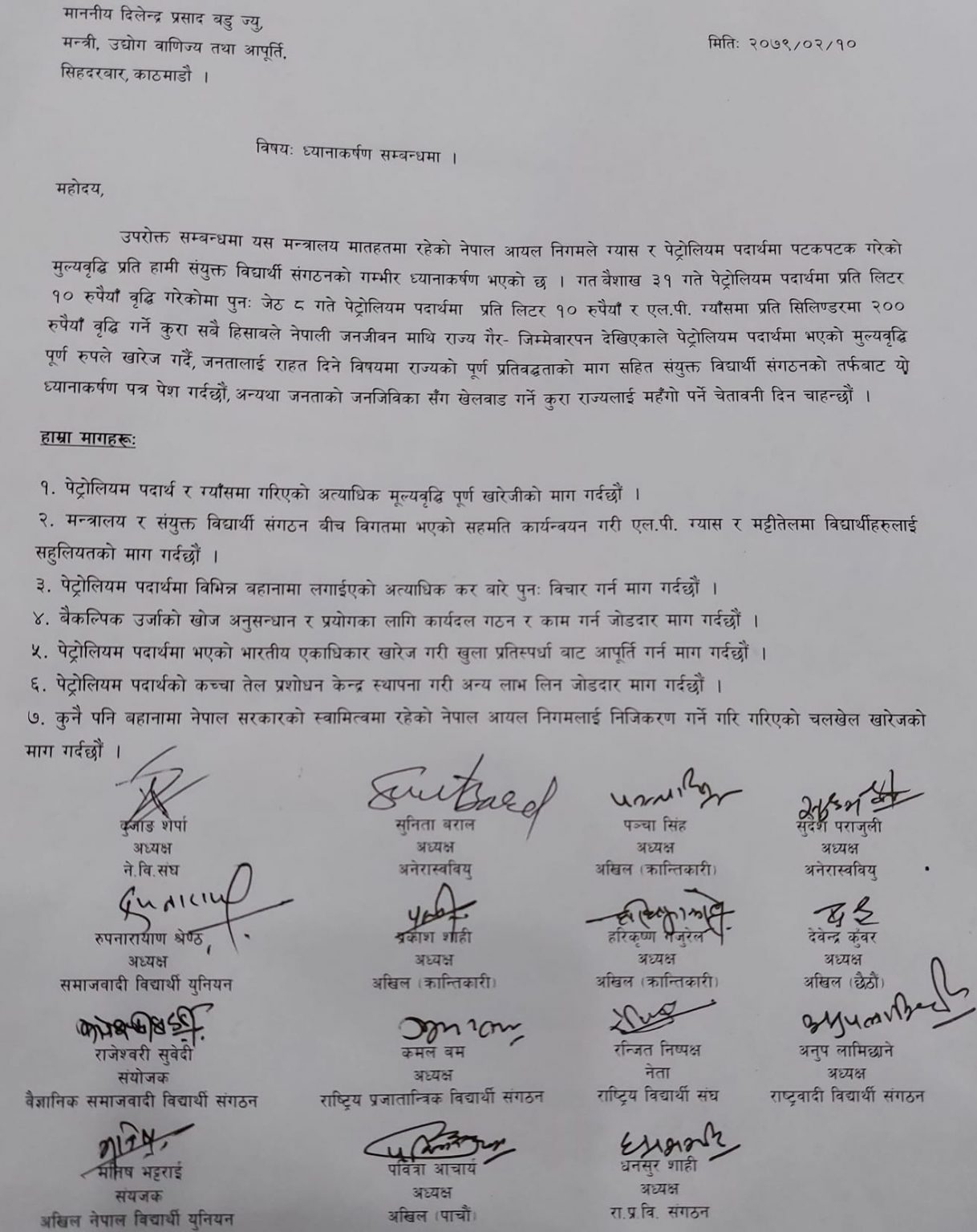 १५ विद्यार्थी संगठनहरुले जनतालाई राहत दिने विषयमा राज्यको पूर्ण प्रतिबद्धताको मागसहित उद्योग वाणिज्य तथा आपूर्ति मन्त्री दिलेन्द्र प्रसाद बडुलाई ध्यानाकर्षण पत्र बुझाएका हुन् ।