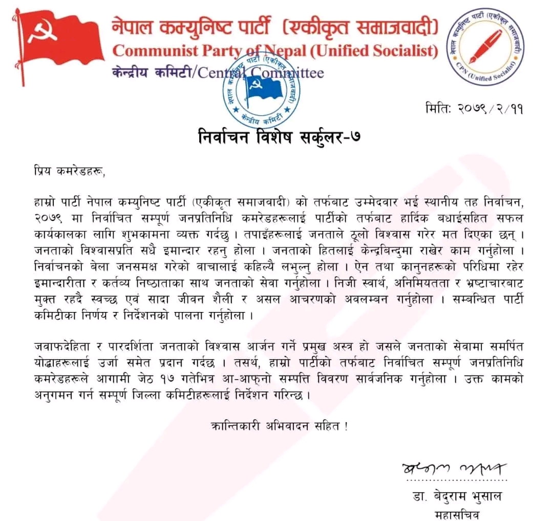 काठमाडौ।नेकपा(एकिकृत समाजवादी) ले स्थानीय तहमा निर्वाचित आफ्ना नेतालाई यही जेठ १७ गतेभित्र सम्पत्ति विवरण सार्वजनिक गर्न निर्देशन दिएको छ ।
