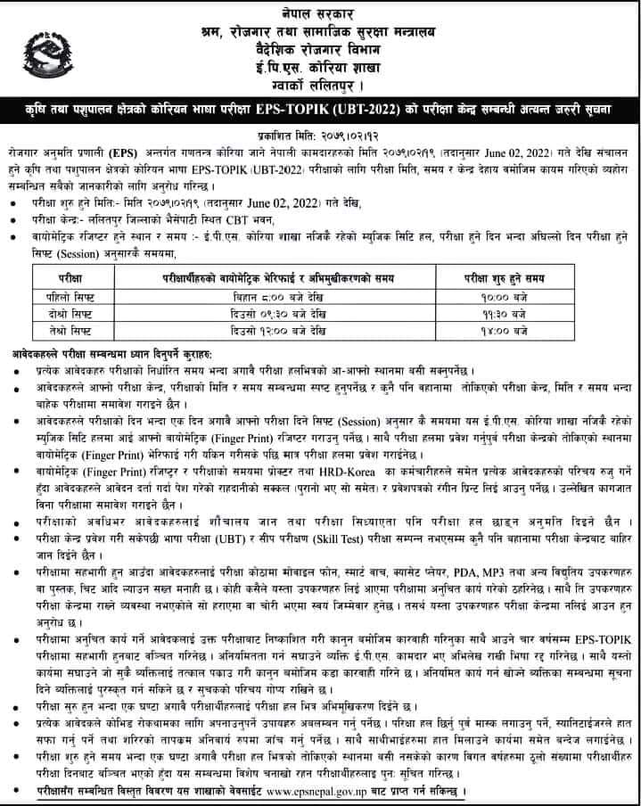 परीक्षाका साथै परीक्षा केन्द्र,मिति र समय पनि तोकेर श्रम,रोजगार तथा सामाजिक सुरक्षा मन्त्रालय वैदेशिक विभागले सूचना प्रकाशित गरेको छ।