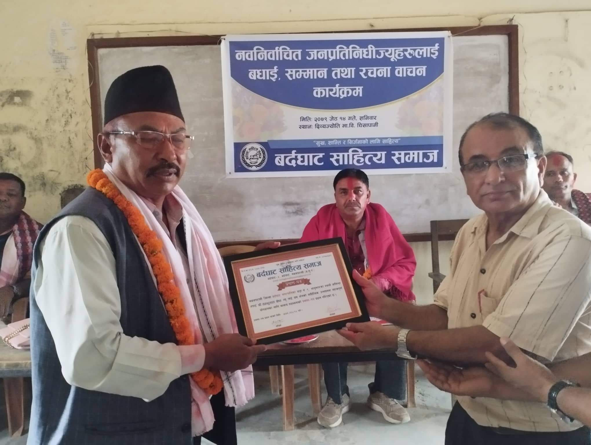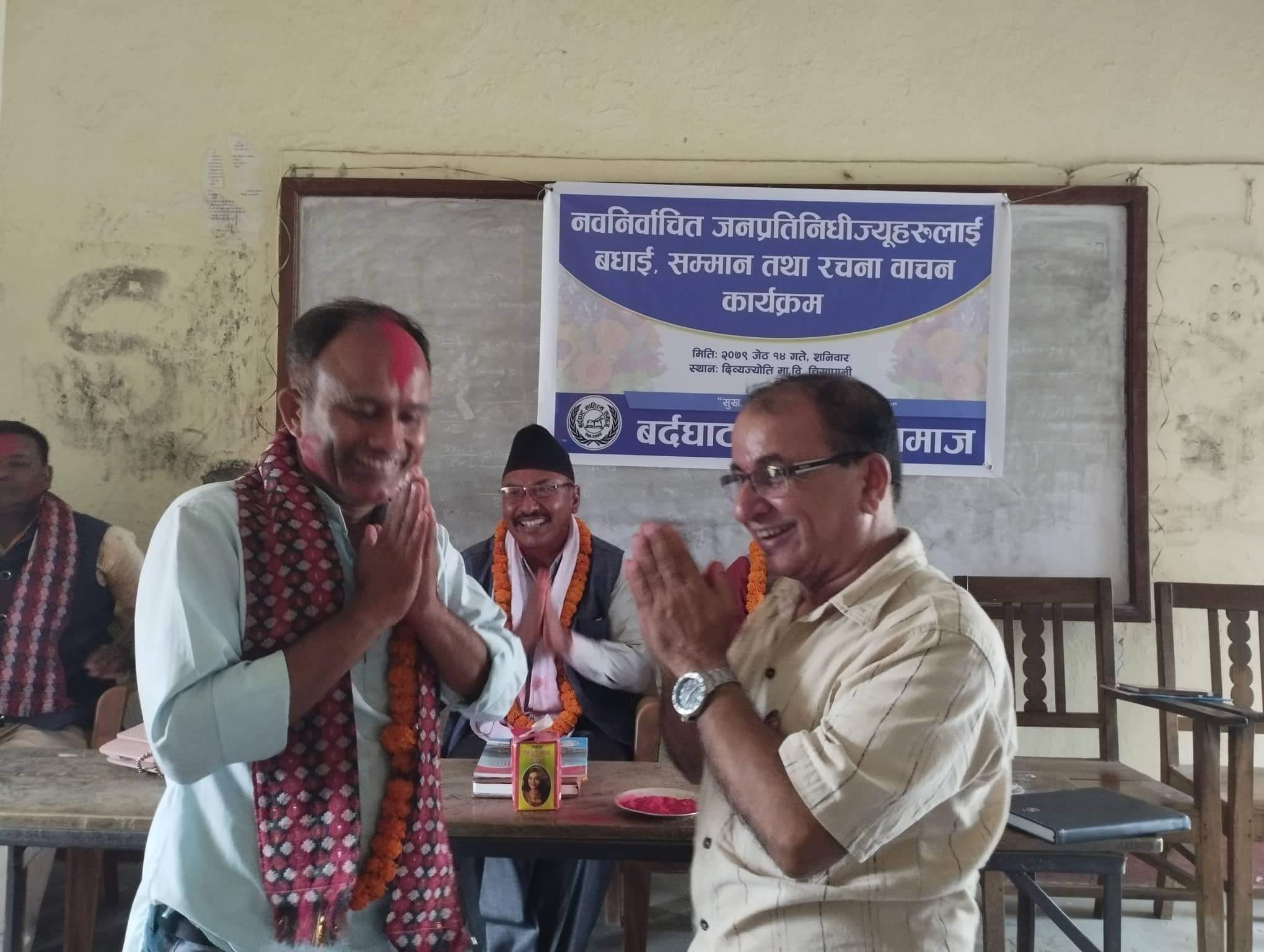 बर्दघाट साहित्य समाजले आज आयोजना गरेको कार्यक्रममा नवनिर्वाचित जन प्रतिनिधिहरुलाई सम्मान गरेको छ । उक्त कार्यक्रममा प्रदीप भट्टराई, लक्ष्मी बर्तौला, नारायण बस्याल,बाबुराम गिरि रबिन शर्मा, बिश्वराज भट्टराई, तुल्सिराम पाण्डे, समाजका अध्यक्ष हुमानाथ आचार्यको अध्यक्षमा भएको कार्यक्रममा उपाध्यक्ष प्रकाश न्यौपानेको स्वागत रहेको कार्यक्रमको संचालन सचीव रबिन शर्मा चापागाईंले गर्नु भएको थियो ।
