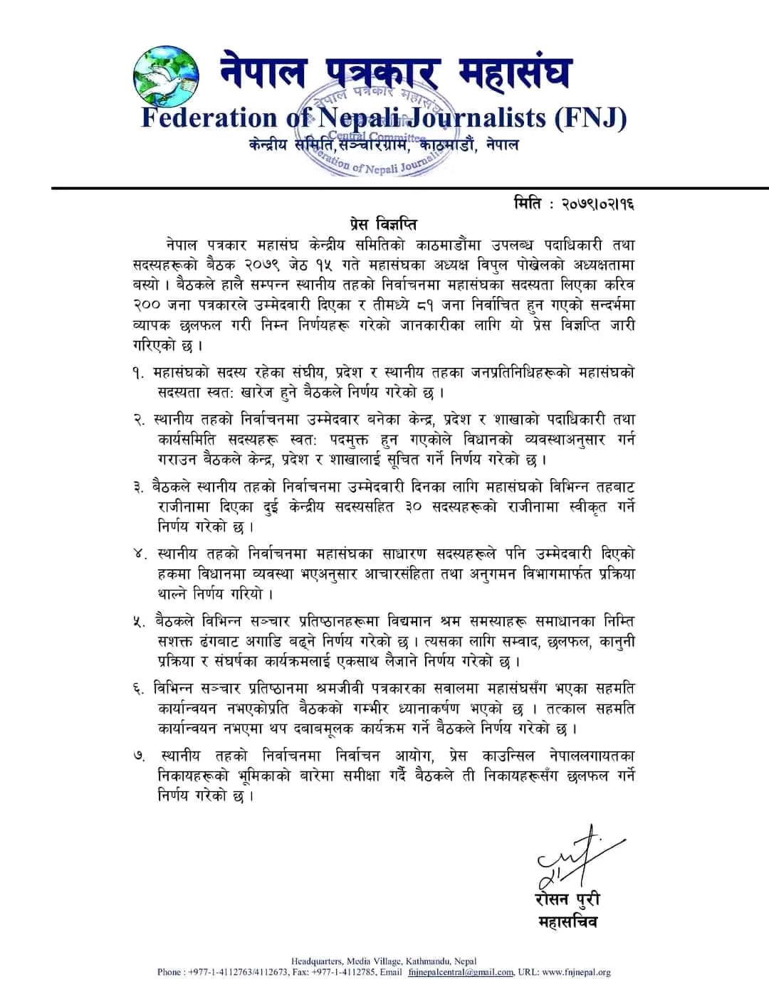 अध्यक्ष विपुल पोख्रेलको अध्यक्षतामा बसेको बैठकले हालै सम्पन्न स्थानीय तहको निर्वाचनमा महासंघका सदस्यता लिएका करिव २०० जना पत्रकारले उम्मेदवारी दिएका र तीमध्ये ८१ जना निर्वाचित हुन गएको सन्दर्भमा व्यापक छलफल गरी सो निर्णय गरिएको महासचिव रोशन पुरीले जानकारी दिनुभयो ।