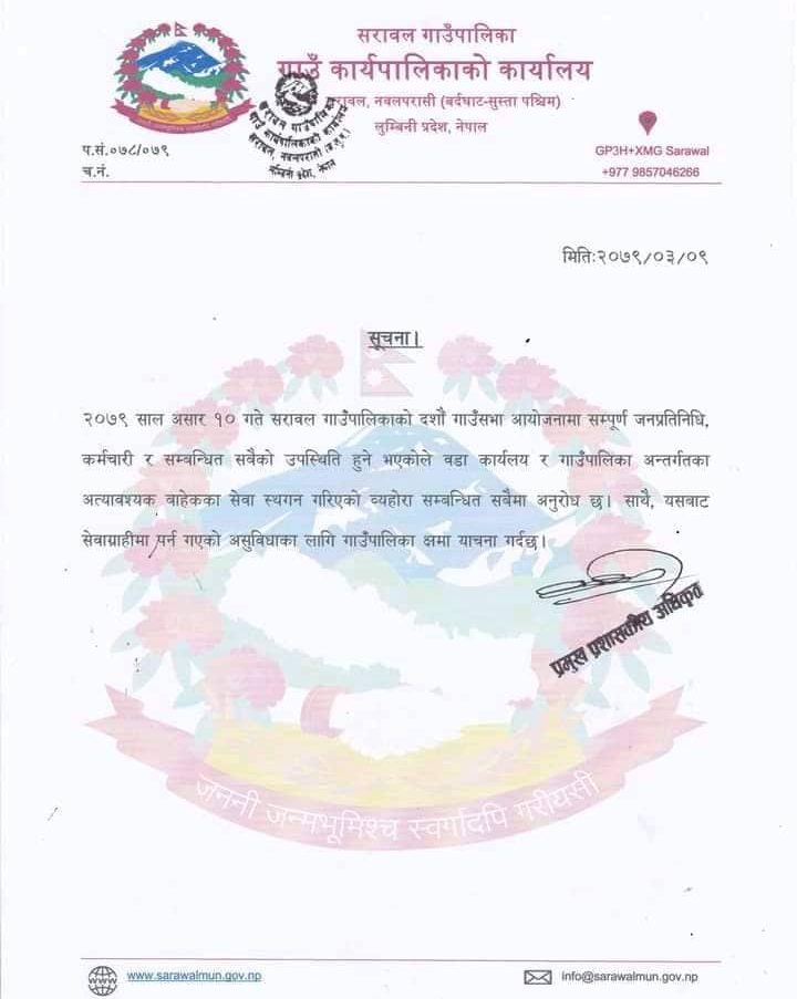 सरावल।पश्चिम नवलपरासीको सरावल गाउँपालिकाको शुक्रबार दशौं गाउँसभाको अवसरमा गाउँपालिकाको  अत्यावश्यक बाहेकका सेवा स्थगन हुनेभएको छ।