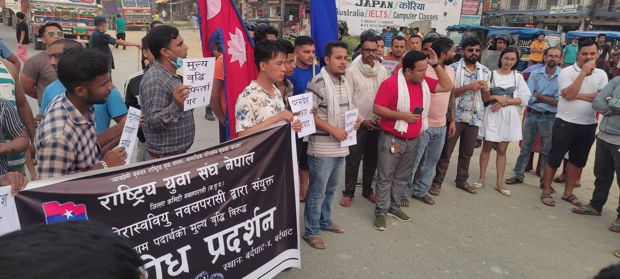 बर्दघाट।मूल्यवृद्धिको विरोधमा पश्चिम नवलपरासीको बर्दघाटमा राष्ट्रिय युवा संघ नेपाल जिल्ला कमिटी र अनेरास्ववियु नवलपरासीको संयुक्त आयोजनामा विरोध प्रदर्शन सहित आधाघण्टा चक्काजाम गरेको छ।