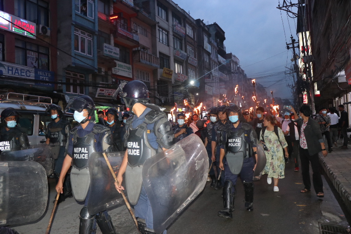 काठमाडौं।नेपाल कम्युनिष्ट पार्टीसहित चार दलिय मोर्चाले नागरिकता बिधेयक,अमेरिकी सहयोग परियोजना एमसीसी र शैन्यमोर्चा एसपीपीबिरुद्ध मसाल जुलुस प्रदर्शन गरेका छन्। काठमाडौंको मुख्य सडक बागबजारमा चार कम्युनिष्ट पार्टीका कार्यकर्ताले मसाल जुलुस प्रदर्शन गरेका हुन।