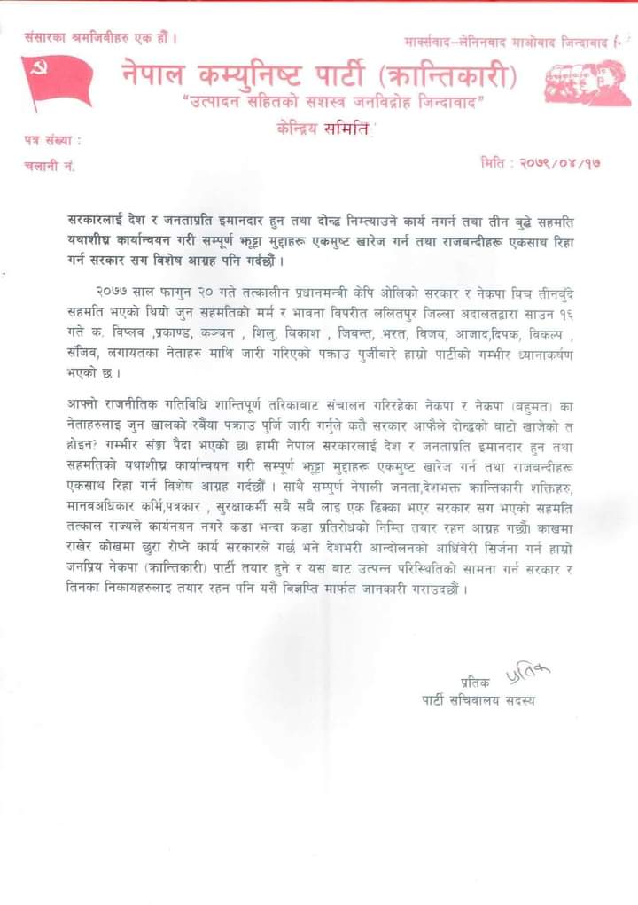 विज्ञप्तिमा गत २०७७ साल फागुन २० गते तत्कालीन प्रधानमन्त्री केपि ओलिको सरकार र नेकपा विच तीनबुँदे सहमति भएको थियो जुन सहमतिको मर्म र भावना विपरीत ललितपुर जिल्ला अदालतद्वारा साउन १६ गते विप्लव,प्रकाण्ड,कञ्चन,शिलु,विकाश,जिवन्त,भरत,विजय,आजाद,दिपक,विकल्प,संजिव लगायतका नेताहरु माथि जारी गरिएको पक्राउ पुर्जीबारे पार्टीको गम्भीर ध्यानाकर्षण भएको बताएको छ।