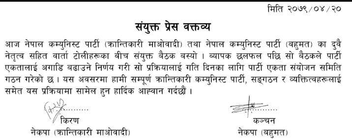 क्रान्तिकारी माओवादीका महासचिव मोहन वैद्य ‘किरण’ र नेकपा बहुमतका संयोजक धर्मेन्द्र बास्तोला‘कन्चन’ सहितको वार्ता टोलीकाे संयुक्त बैठकले पार्टी एकता गर्ने सहमति गरेको हो।