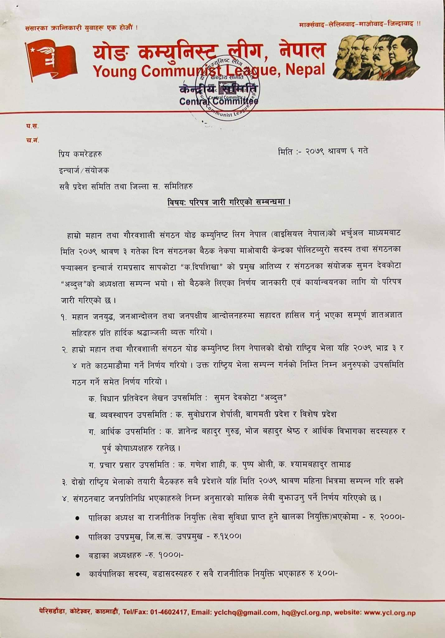 गत साउन ३ गते बसेको योङ्ग कम्युनिस्ट लिग केन्द्रीय समिति भर्जुअल बैठकले सापकोटालाई जिल्ला संयोजक पदमा मनोनयन गरेको हो।