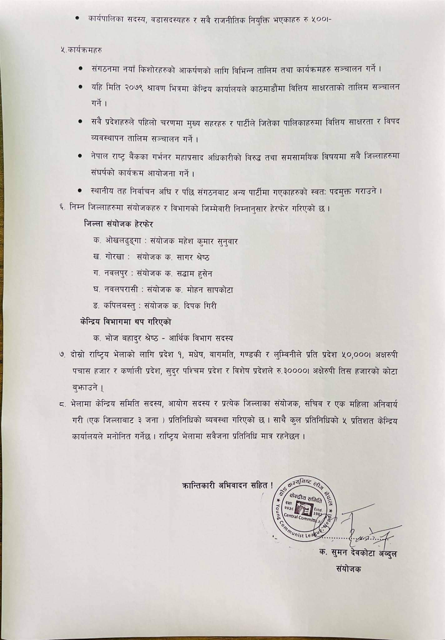 बैठकले जिल्लामा अध्यक्ष हेरफेर गर्ने क्रममा नवलपरासीको अध्यक्ष पदमा सापकोटालाइ मनोनयन गर्ने निर्णय गरिएको हो।निवर्तमान अध्यक्ष दिपक राना केन्द्रिय सदस्य बनेपछी संयोजकमा सापकोटालाई मनोनयन गरिएको हो।सापकोटा बर्दघाट-४ का स्थानीय बासी हुन उनी युवा माझ लोकप्रिय छन।