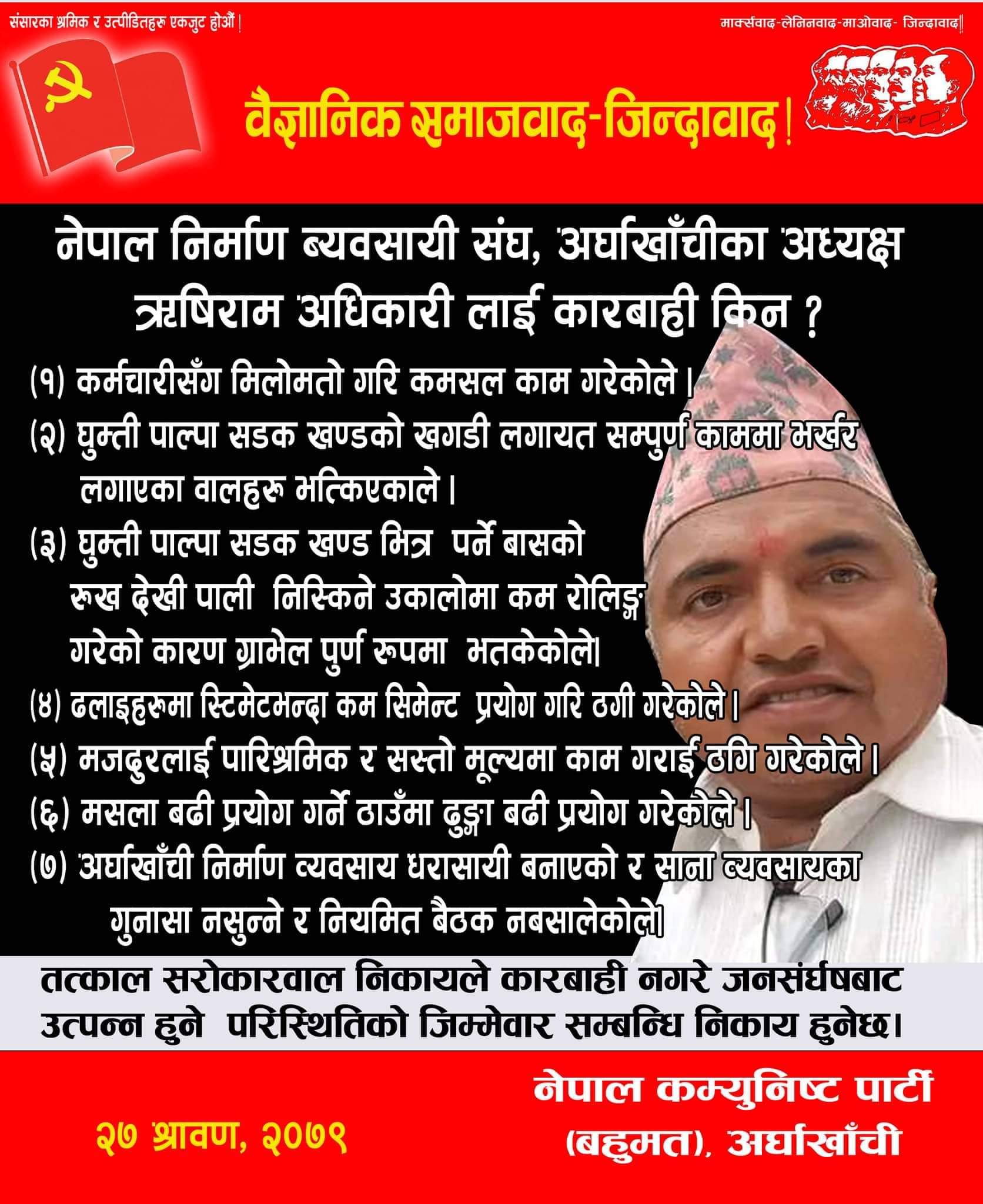 निर्माण व्यवसायी अध्यक्षको घरमा विभिन्न आरोप सहित कालो ब्यानर टागेको छ।कालो ब्यानरमा कर्मचारी संग मिलिमतोमा कमसल काम गरेको,मजदुरलाई समयमा पारिश्रमिक नदिएको,अर्घाखाँची व्यवसायी निर्माण धरासायी बनाएको र साना व्यसवायीका गुनासा नसुन्न्ने र नियमित बैठक नबस्ने गरेको जस्ता आरोपमा कालो ब्यानर टागिएको छ ।