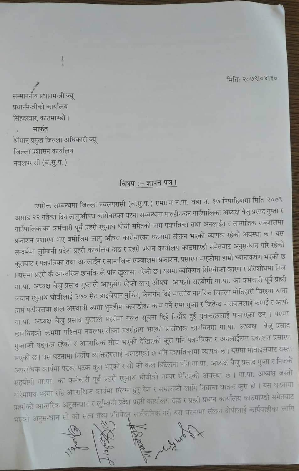 गत असार २२ गते रामग्राम नगरपालिका १७ पिपरहियामा गाउँपालिका अध्यक्ष गुप्ताको निर्देशनमा गाउँपालिकाका नगर प्रहरी (पूर्व प्रहरी)रघुनाथ धोवीले गुप्ता र पासवानलाई चिया पसलभित्र बोलाएर आफैले ल्याएको लागु औषध उनीहरुको भन्दै प्रहरीलाई बोलाएर पक्राउ गराएको ज्ञापनपत्रमा उल्लेख छ।