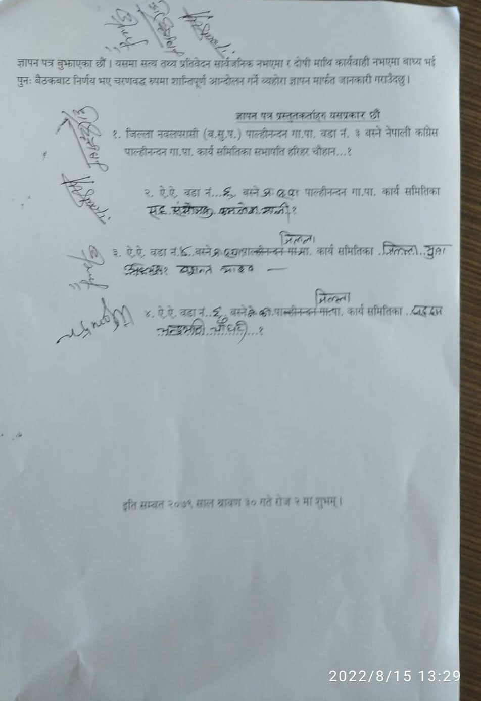 पाल्हिनन्दन गापा अध्यक्ष गुप्तालाई कार्वाहीको माग(ज्ञापनपत्र सहित)