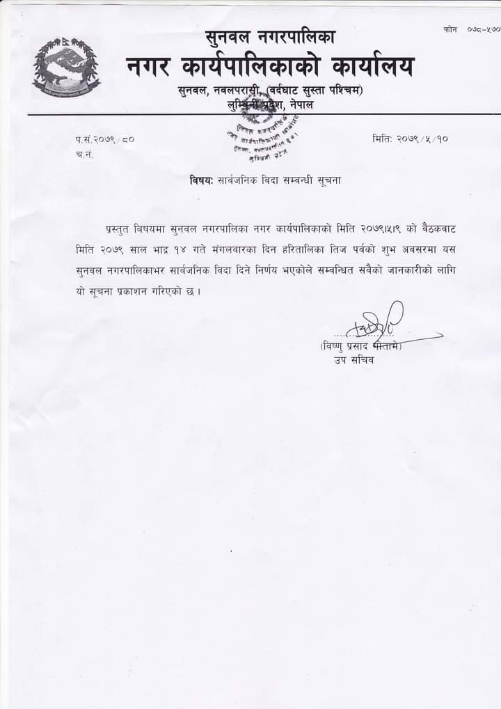 सुनवल।सुनवल नगरपालिकाले यही भदौ १४ मंगलबार सार्वजनिक विदा दिइएको छ।