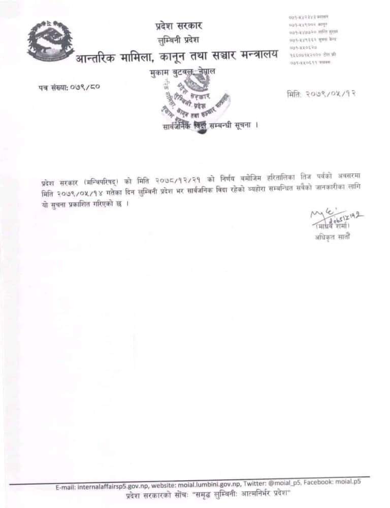 प्रदेश सरकार मन्त्रीपरिषदको २०७८/१२/२२ को निर्णय अनुरुप लुम्बिनी प्रदेशभर सार्वजनिक बिदा दिइएको उल्लेख छ।