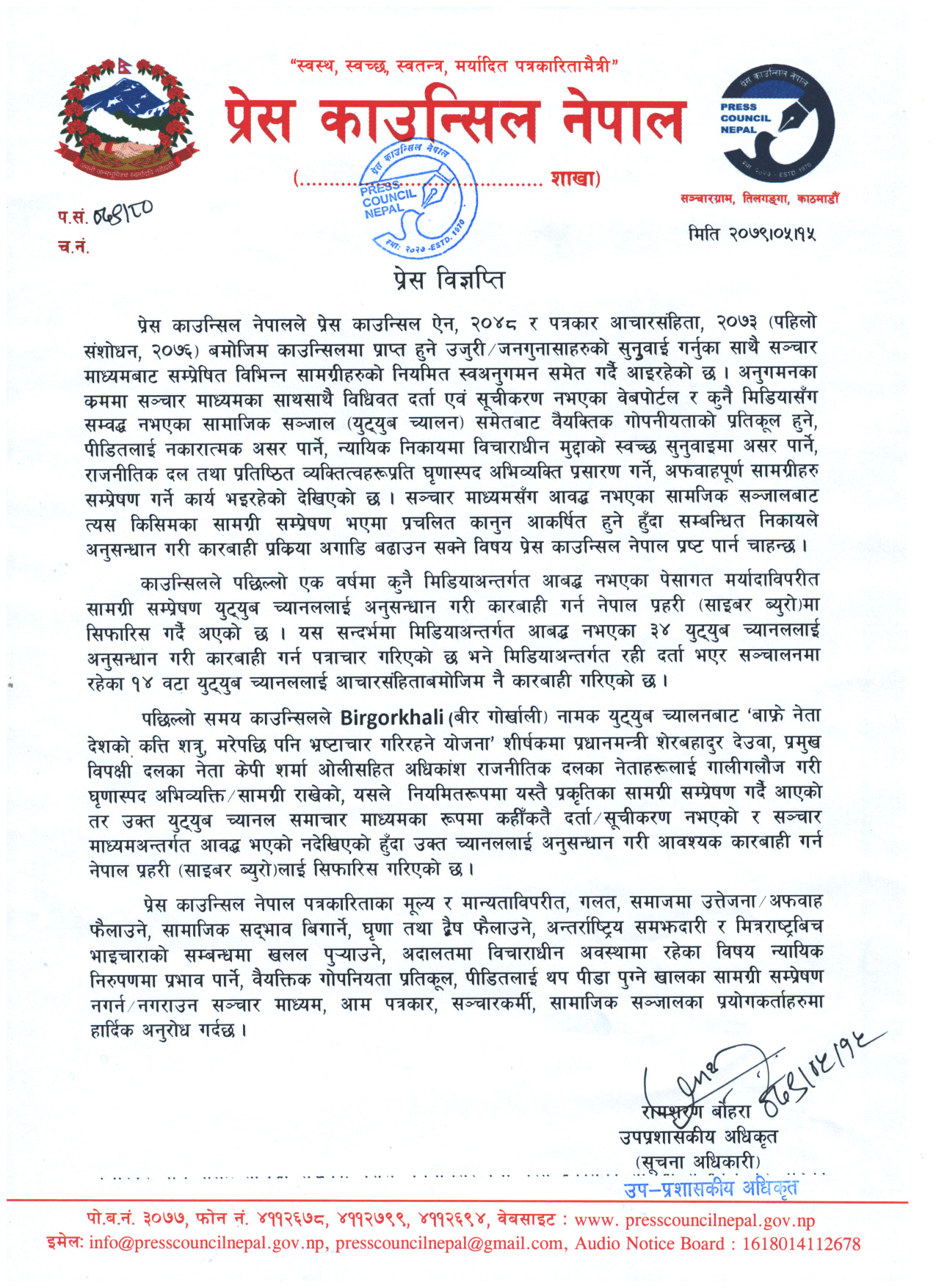 सामाजिक सद्भाव बिथोल्ने,जातिय एवं धार्मिक सहिष्णुता खल्बलाउने किसिमका सामग्रीहरू सम्प्रेषण गर्ने Birgorkhali (वीरगोर्खाली) नामक युट्युब च्यानललाई अनुसन्धान गरी आवश्यक कारबाही गर्न नेपाल प्रहरी(साइबर ब्युरो)लाई सिफारिस गरेको हो।
