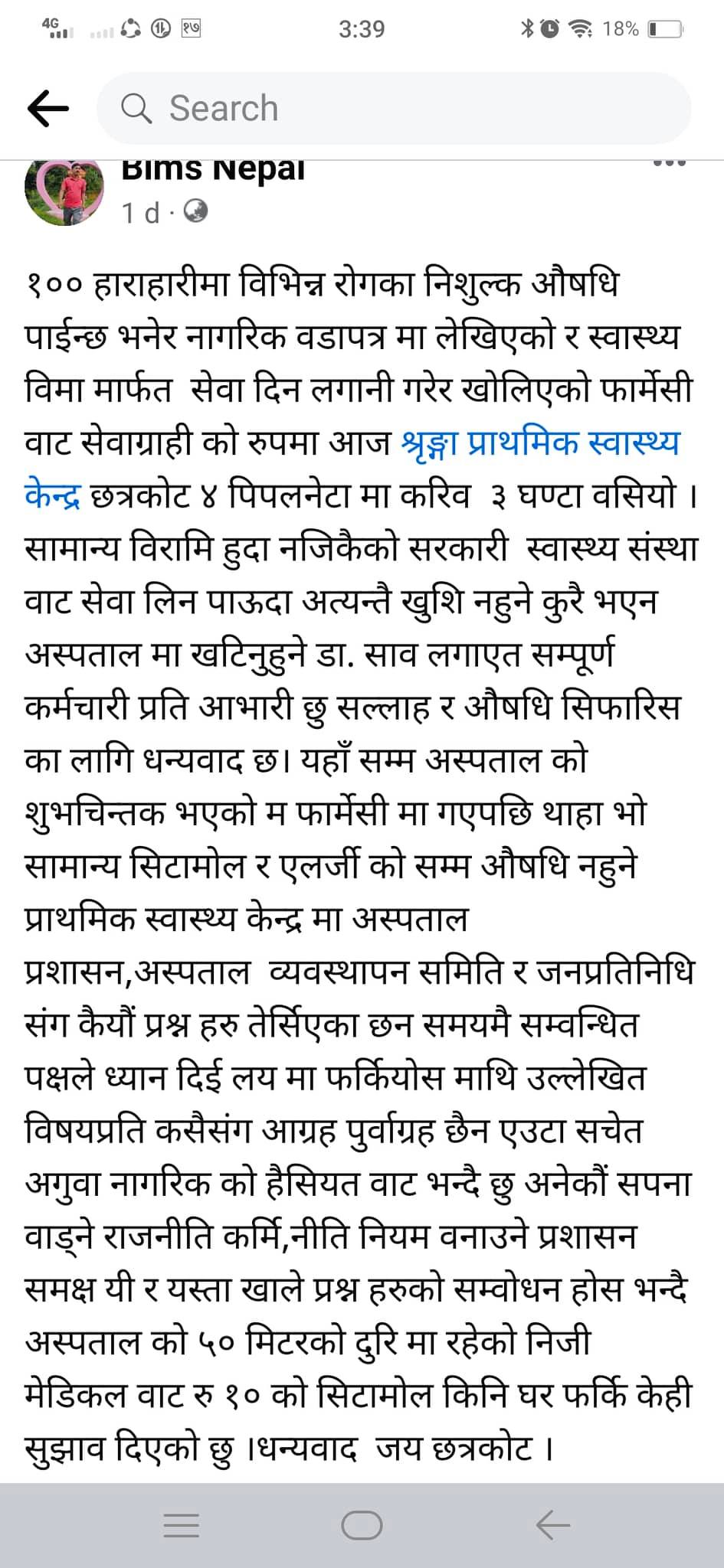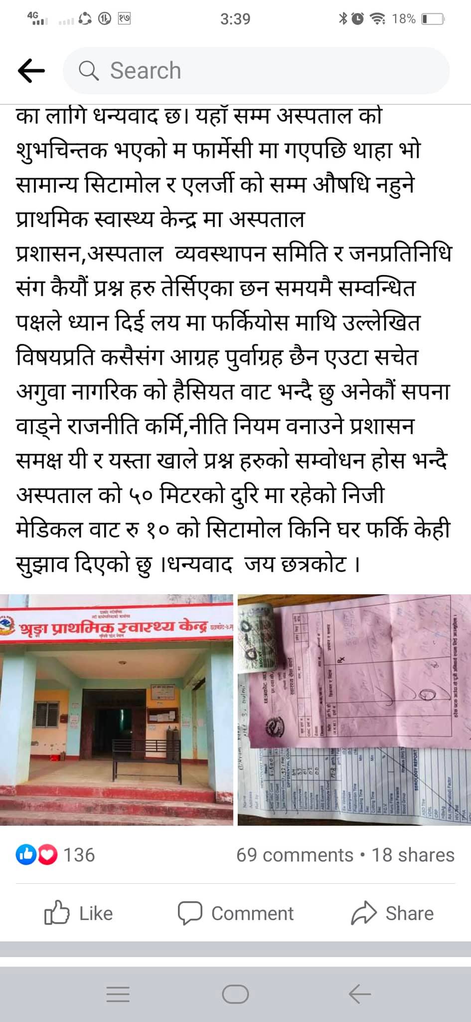 डाक्टर साबले चेक पनि गर्नुभयो औषधीको सिफारिस पनि लेखेर दिनुभयो।डाक्टरले लेखेर दिएको औषधिको सिफारिसमा सिटामोल समेत लेखेको थियो तर औषधि दिने त्यहाँका कर्मचारीले सिटामोल समेत नदिएर बाहिर किन्न बाध्य पारिएको उनको आरोप रहेको छ। स्टाटसमा आएका अधिकांश कमेन्टहरु मा समेत स्थानीयहरूको स्वास्थ्य केन्द्र प्रति गुनासो झल्किएको देख्न सकिन्छ।