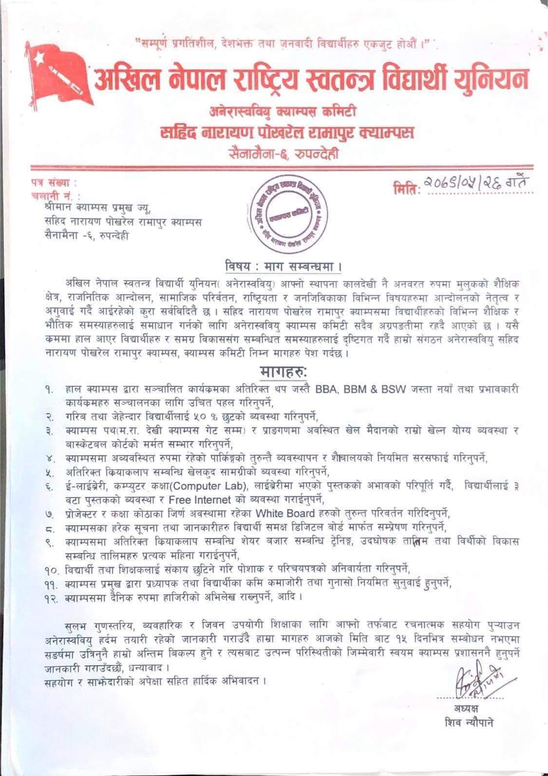 सैनामैना।अखिल नेपाल स्वतन्त्रत विद्यार्थी युनियन (अनेरास्ववियुले) सहिद नारायण पोखरेल रामापुर क्याम्पस समक्ष १२ बुदे माग राखेको छ।क्याम्पसमामा देखिएका समस्या,विद्यार्थीका माग र भाैतिक अवस्थिति आदि कुरा सो माग पत्रमा उल्लेख गरिएको अध्यक्ष शिव न्याैपानेले जानकारी दिनुभएको छ।