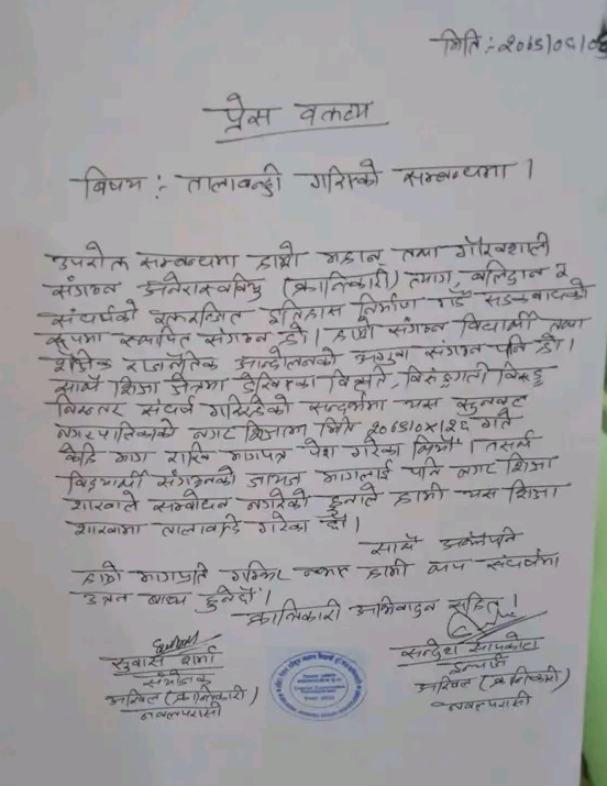 हाम्रा मागहरुलाई बेवास्ता गरेको भन्दै तालाबन्दी गर्न बाध्य भएको संगठन जारी गरेको विज्ञप्तिमा उल्लेख छ।
