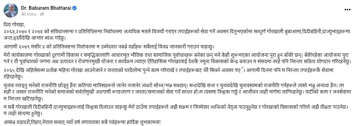 उनले आज सामाजिक सन्जालमा लेखेका छन्,‘आगामी २०७९ मंसिर ४ को प्रतिनिधिसभा निर्वाचनमा म उम्मेदवार नबन्ने यहाँहरू सबैलाई विनम्र जानकारी गराउन चाहन्छु।’