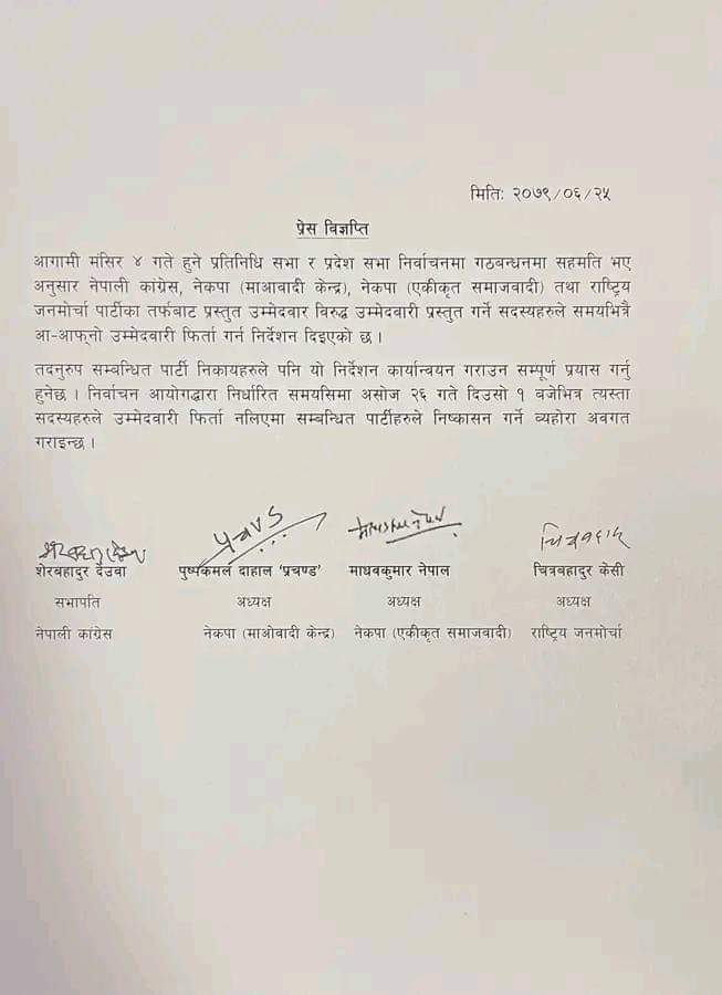 सत्ता गठबन्धनमा आवद्ध कांग्रेस,माआवादी केन्द्र,नेकपा एस तथा राष्ट्रिय जनमोर्चा पार्टीका तर्फबाट प्रस्तुत उम्मेदवारविरुद्ध उम्मेदवारी प्रस्तुत गर्ने सदस्यहरूले समयभित्रै आ-आफ्नो उम्मेदवारी फिर्ता गर्न निर्देशन दिएको हो।