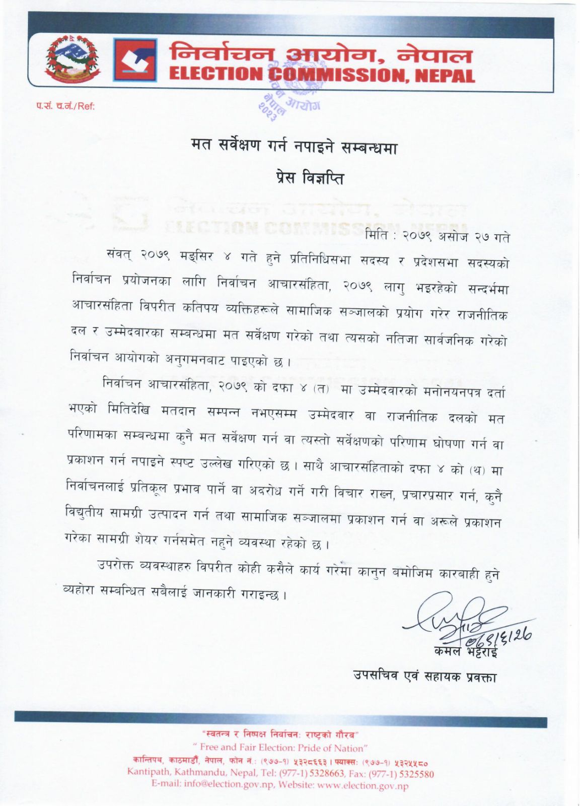 ‘निर्वाचन आचारसंहिता, २०७९ को दफा ४ (त) मा उम्मेदवारको मनोनयनपत्र दर्ता भएको मितिदेखि मतदान सम्पन्न नभएसम्म उम्मेदवार वा राजनीतिक दलको मत परिणामका सम्बन्धमा कुनै मत सर्वेक्षण गर्न वा त्यस्तो सर्वेक्षणको परिणाम घोषणा गर्न वा प्रकाशन गर्न नपाइने स्पष्ट उल्लेख गरिएको छ,’ आयोगले जारी गरेको विज्ञप्तिमा उल्लेख छ।