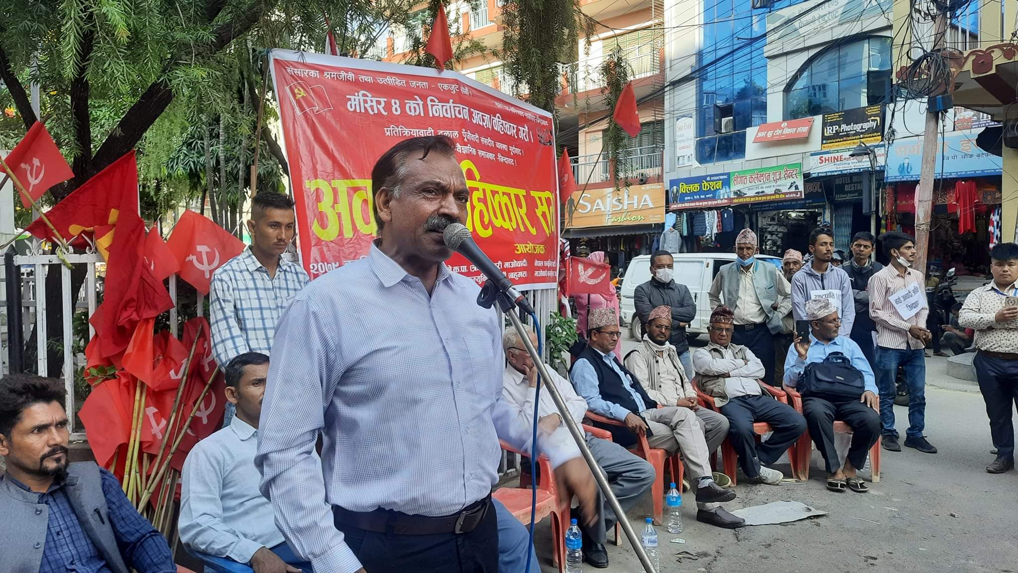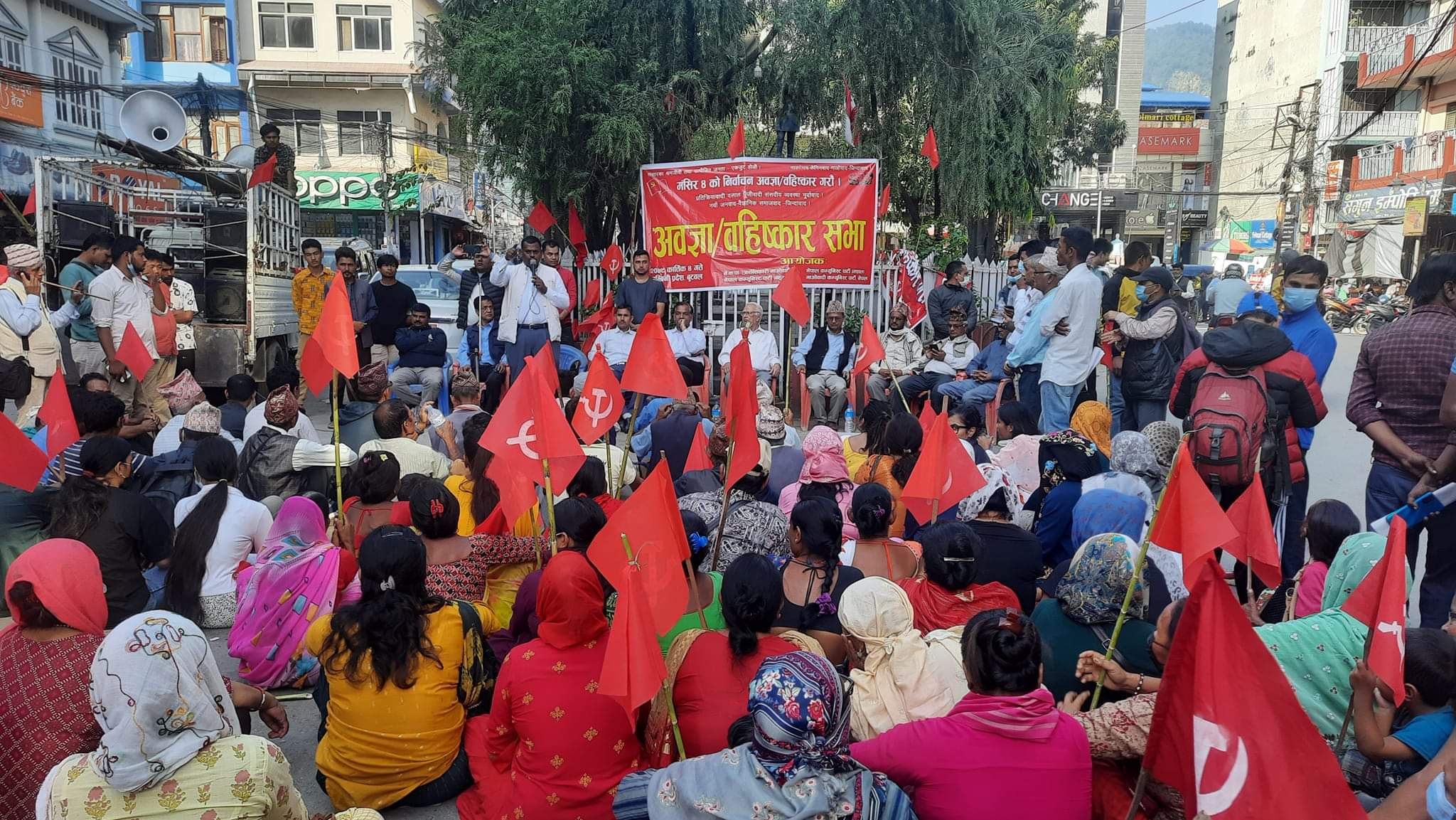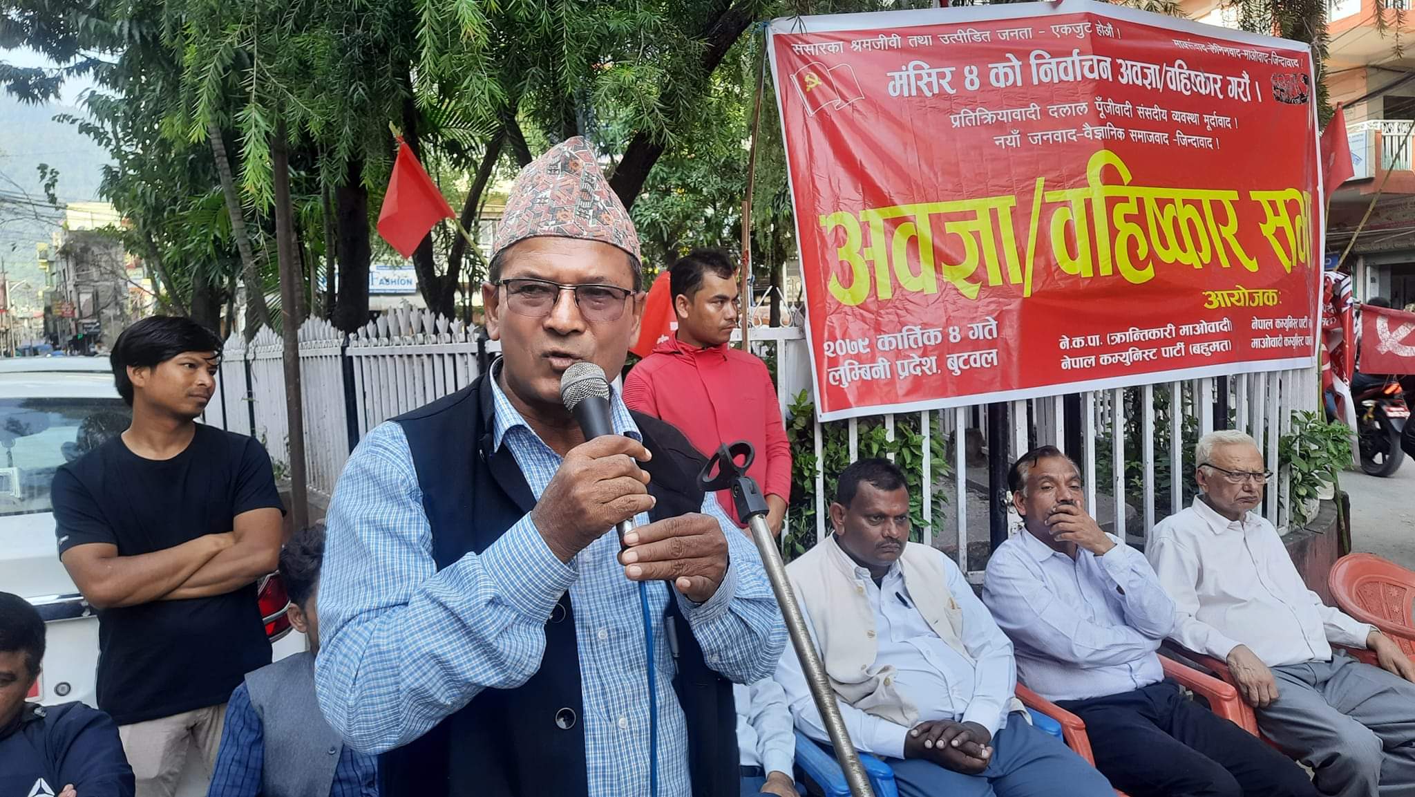 बुटवल।नेकपा(क्रान्तिकारी माओवादी)सहित चार दलीय मोेर्चाले बुटवलमा निर्वाचन बहिष्कार अबज्ञा सभा गरेका छन।उक्त सभामा बोल्ने चारदलका कम्युनिष्ट नेताहरुले संसदीय व्यवस्थाका विरुद्ध सडकमा आउन जनतालाई आब्हान गरे।सभा नेकपा(क्रान्तिकारी माओवादी),नेकपा (बहुमत),नेकपा(मशाल) र माओवादी कम्युनिस्ट पार्टी नेपालले संयुक्त रुपमा गरेका हुन।कार्यक्रममा नेकपा(क्रान्तिकारी माओवादी)का स्थायी समिति सदस्य सिपी गजुरेलले दलाल संसदीय ब्यवस्थाको अवसान शुरु भईसकेका बताउदै दलालहरुलाई भोट दिएर राष्ट्रघात जनघातमा समाबेश नहुन जनतालाई आब्हान गर्नुभयो।दलालहरुलाई भोट दिएर देशबेचुवाहरुको मतियार बन्नु हुदैन-बुटवलको बीपीचोक स्थित सभालाई सम्बोधन गर्दै नेता गजुरेलले भन्नुभयो-त्यसैले भोट दिन गएर दलालहरुको देशबेच्ने लाईसेन्स नवीकरण नगरौ।