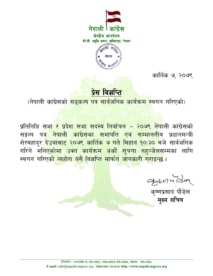 काठमाडौँ।नेपाली कांग्रेसले आगामी निर्वाचनका लागि तयार पारेको सङ्कल्प पत्र सार्वजनिक कार्यक्रम पुनःस्थगित गरेको छ।