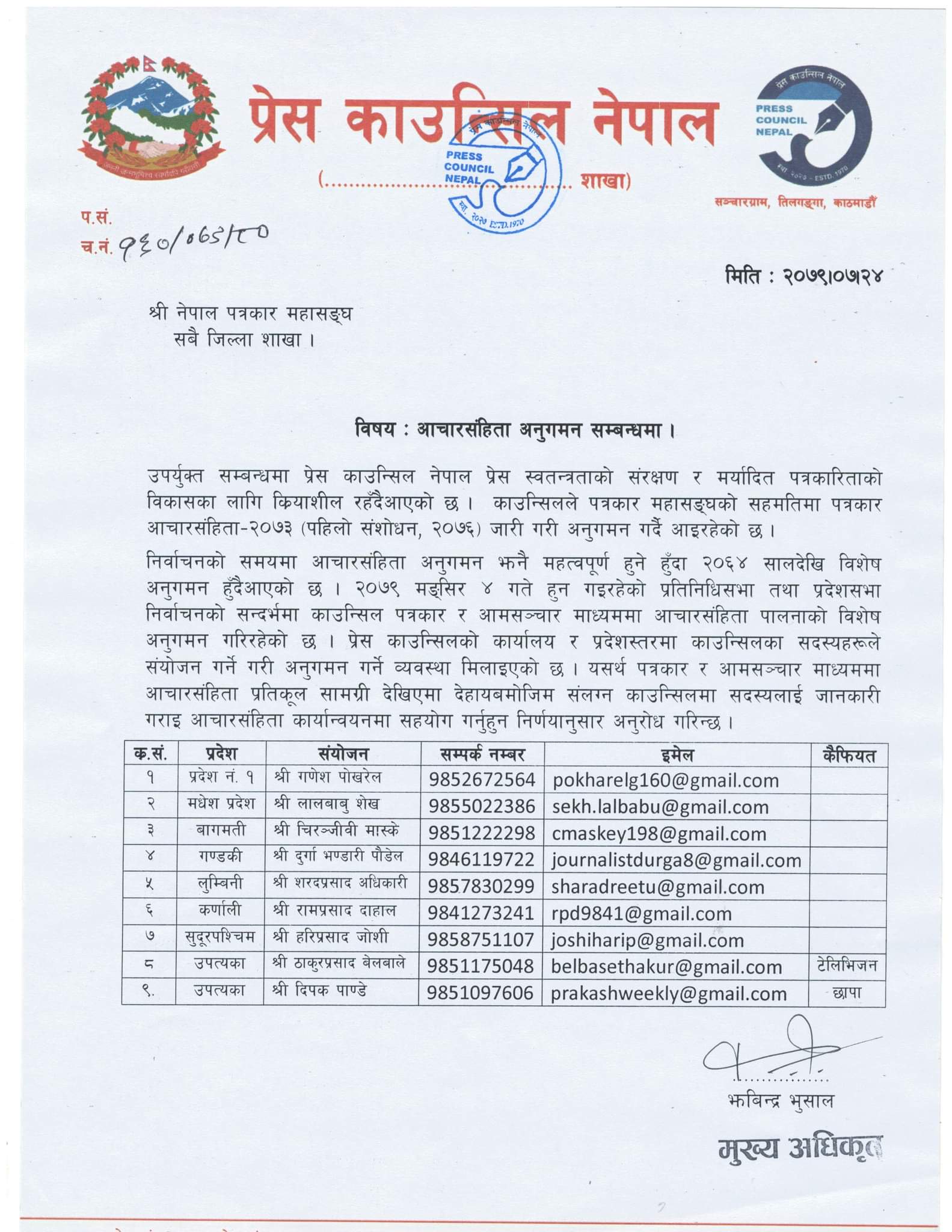 प्रदेश १ मा गणेश पोखरेल,मधेस प्रदेशमा लालबाबु शेख,बाग्मती प्रदेशमा चिरञ्जीवी मास्के,गण्डकी प्रदेशमा दुर्गा भण्डारी पौडेलले संयोजन गर्नुभएको छ।यस्तै लुम्बिनी प्रदेशमा शरदप्रसाद अधिकारी,कर्णाली प्रदेशमा रामप्रसाद दाहाल,सुदूरपश्चिम प्रदेशमा हरिप्रसाद जोशीलाई सम्पर्क गरेर जानकारी दिन सकिन्छ भने उपत्यकामा टेलिभिजन तर्फ ठाकुरप्रसाद बेलबासे र छापा माध्यमतर्फ दीपक पाण्डेलाई सम्पर्क गर्न सकिने काउन्सिलले जनाएको छ।