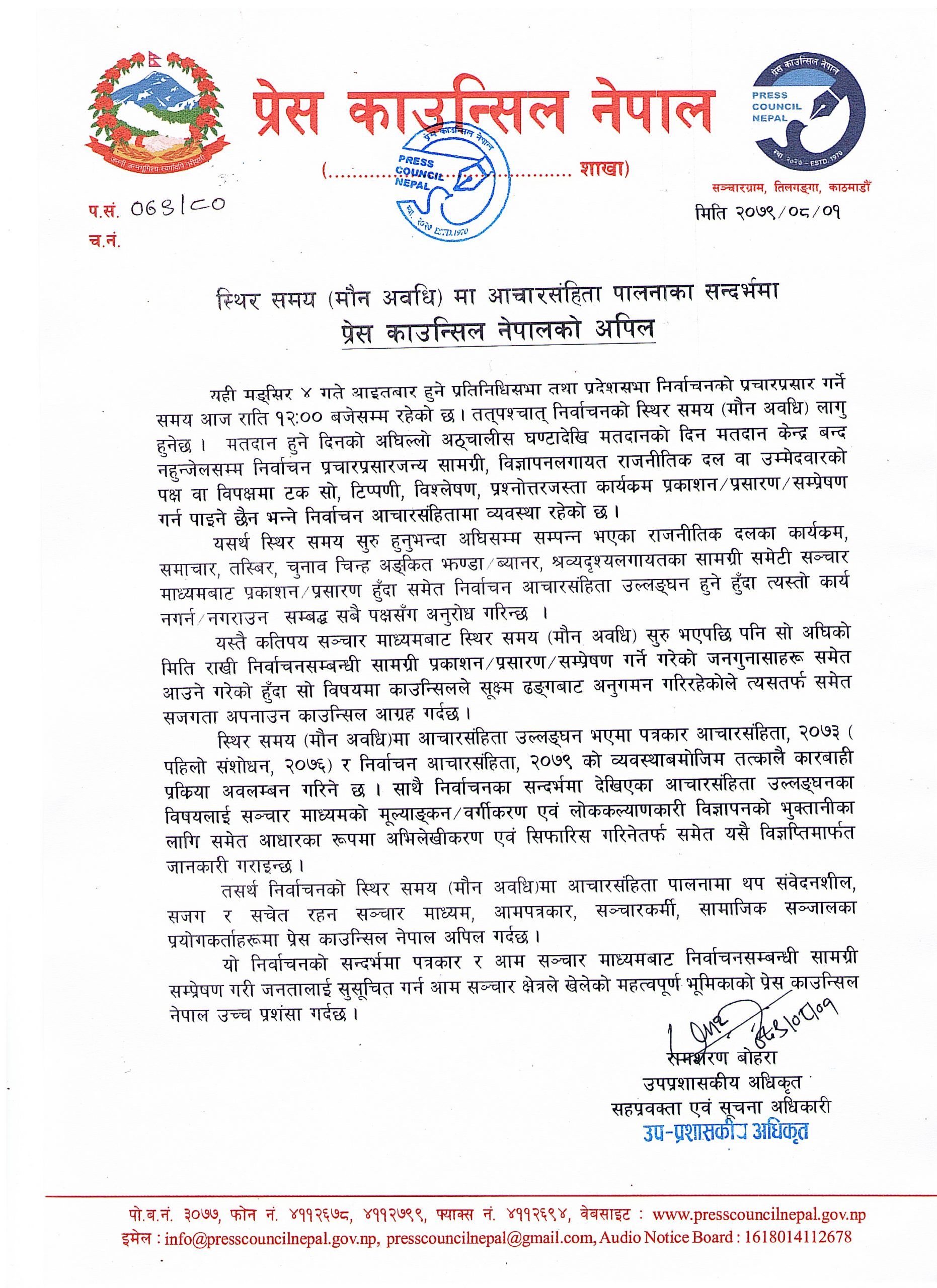 ‘स्थिर समय(मौन अवधि)मा आचारसंहिता उल्लङ्घन भएमा पत्रकार आचारसंहिता,२०७३ (पहिलो संशोधन,२०७६) र निर्वाचन आचारसंहिता, २०७९ को व्यवस्थाबमोजिम तत्कालै कारबाही प्रक्रिया अवलम्बन गरिने छ’ विज्ञप्तिमा भनिएको छ,‘निर्वाचनका सन्दर्भमा देखिएका आचारसंहिता उल्लङ्घनका विषयलाई सञ्चार माध्यमको मूल्याङ्कन/वर्गीकरण एवं लोककल्याणकारी विज्ञापनको भुक्तानीका लागि समेत आधारका रूपमा अभिलेखीकरण एवं सिफारिस गरिनेतर्फ समेत यसै विज्ञप्तिमार्फत् जानकारी गराइन्छ।’