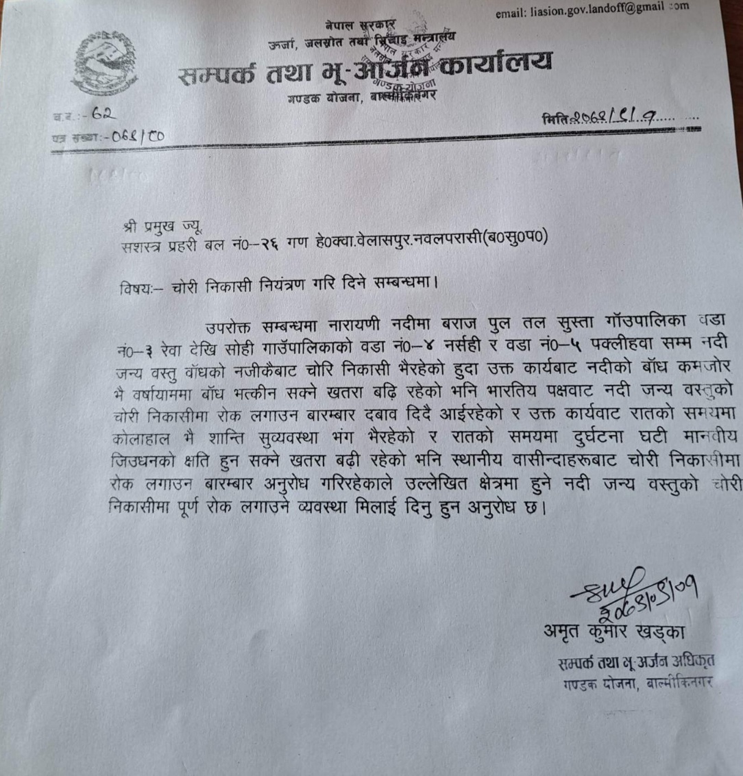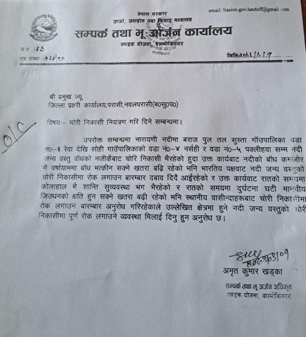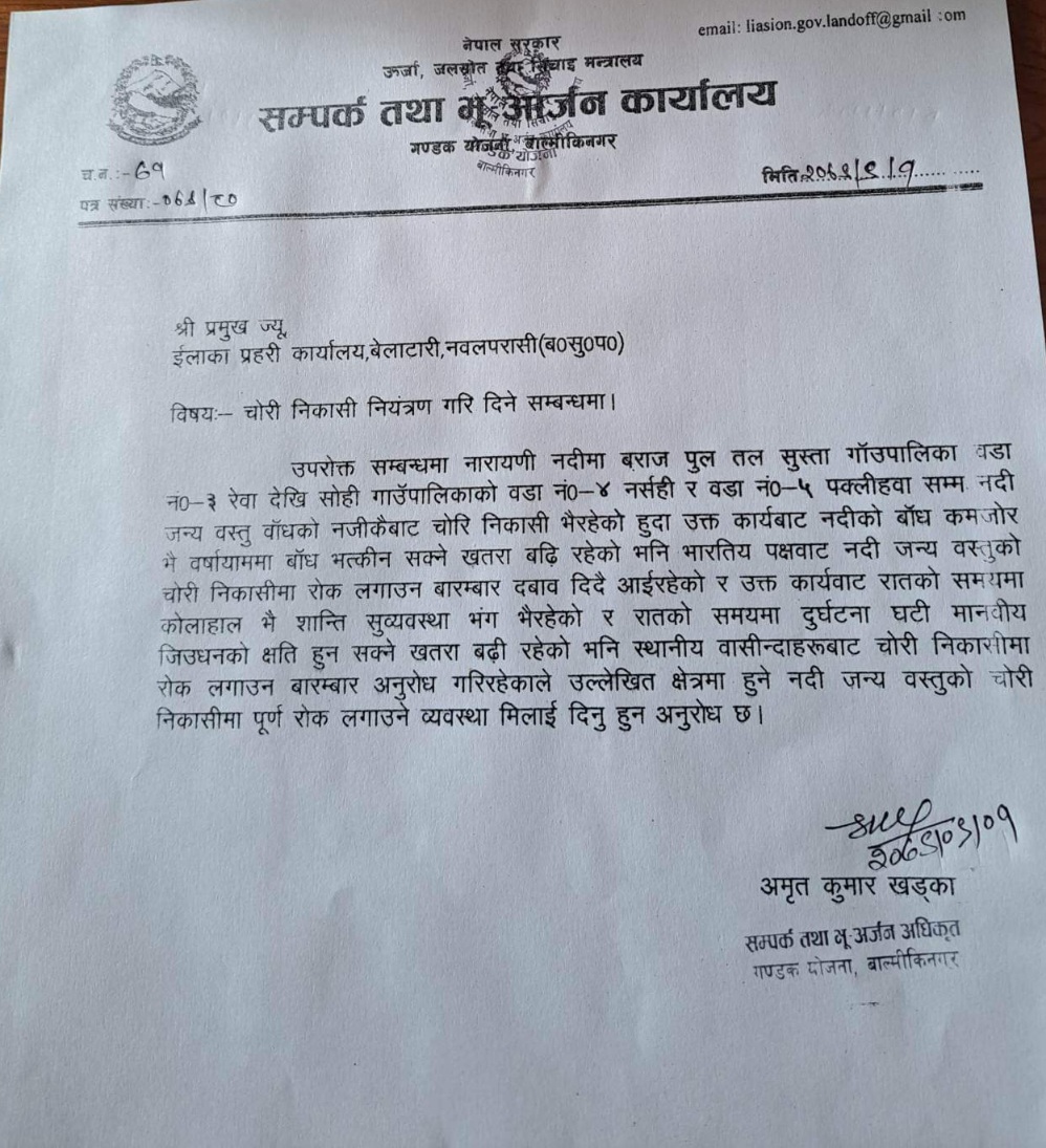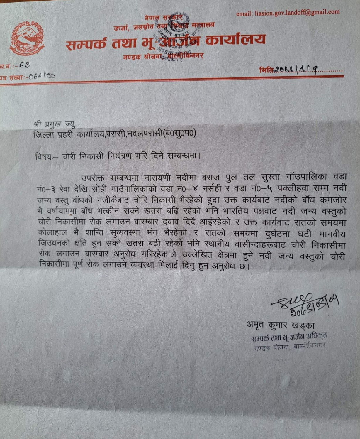 गण्डक योजना सम्पर्क तथा आर्जन कार्यालयका जनसम्पर्क अधिकृत अमृत खडकाले नदिजन्य पदार्थ चोरि निकासी नियन्त्रण रोक्न विभिन्न कार्यालयलाई पत्राचार गरेका हुन।