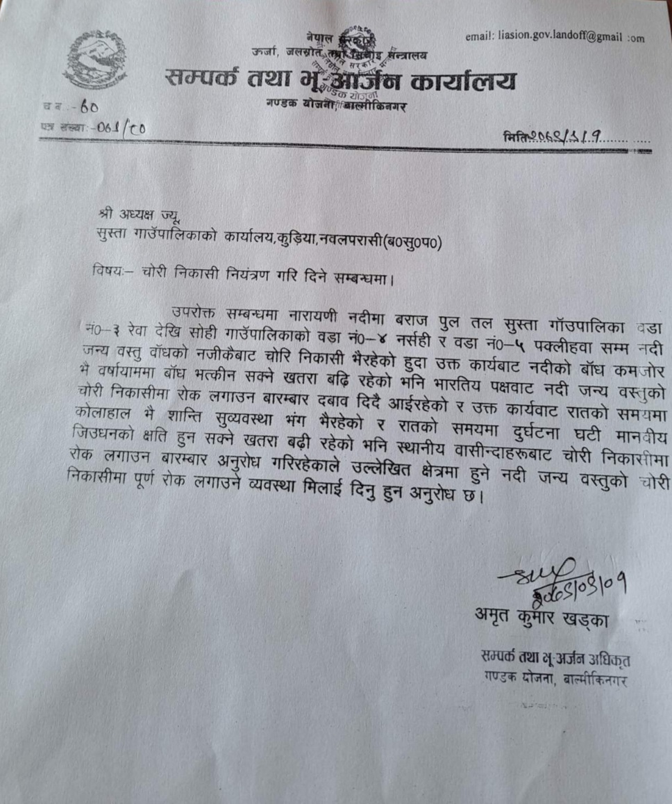 पत्रमा लेखेका छन-“नवलपरासी पश्चिमको नारायणी नदिमा गण्डक बराज पुल तल सुस्ता गापा वडा -३ रेवा देखि सोहिगापाको वडा -४ नर्सही र वडा-५ को पक्लिहवा सम्म नदि जन्य तथा बस्तु बाधको नजिकै बाट चोरि निकासी भैरहेको हुदा उक्त कार्य बाट नदीको बाध कमजोर भई बर्सायाममा बाध भत्किन सक्ने खतरा बढी रहेको भन्दै भारतीय पक्षबाट नदि जन्य बस्तुको चोरि निकासीमा रोक लगाउन बारम्बार दबाद दिदै आइरहेको र रातको समयमा दुर्घटना घटी मानवीय जिउधनको क्षति हुन् सक्ने खतरा बढी रहेको भन्दै उलेखित क्षेत्रमा हुने नदि जन्य बस्तुको चोरी निकासीमा पूर्ण रोक लगाउने व्यवस्था मिलाउन अनुरोध गरेको छ।