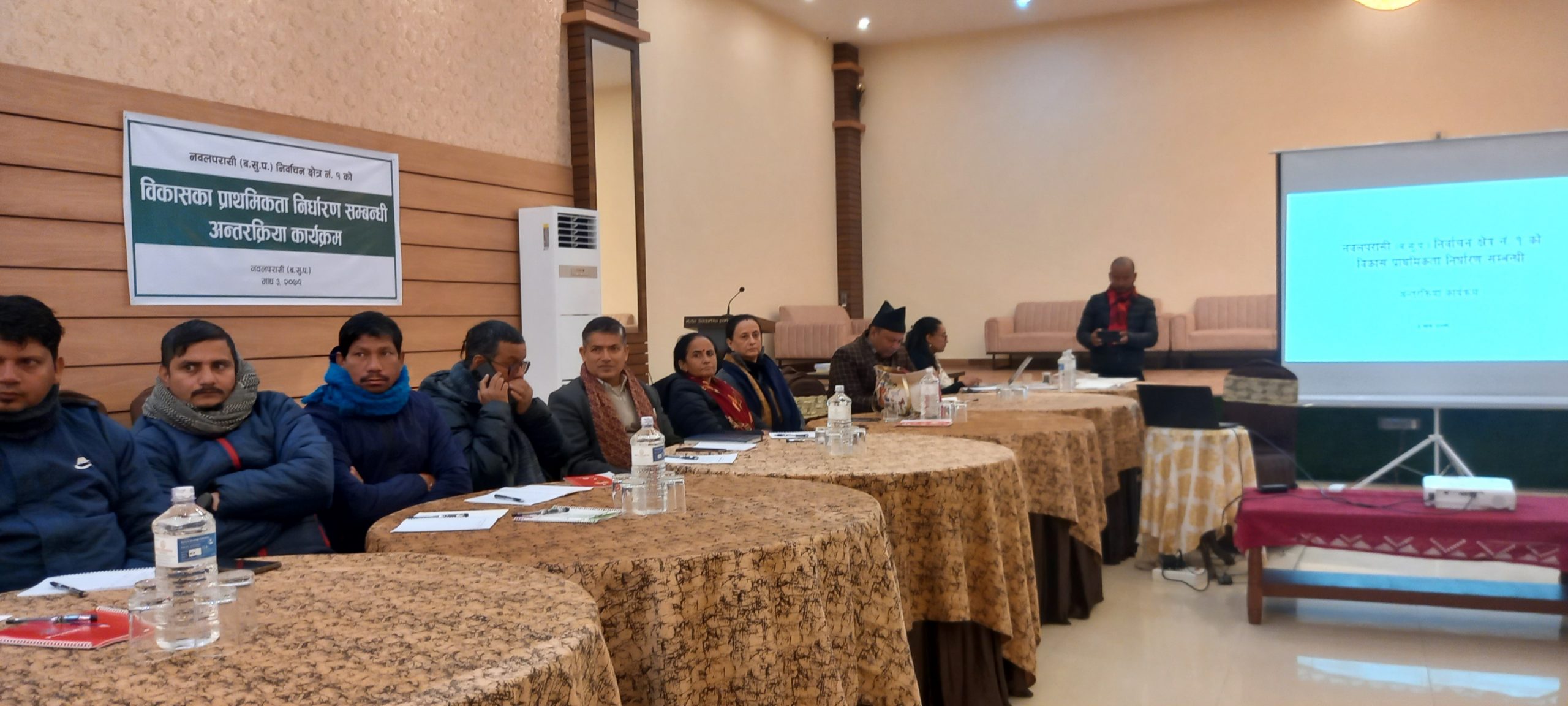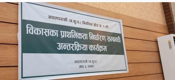 पश्चिम नवलपरासीको क्षेत्र नम्बर १ का सांसद विनोद चौधरीको सचिवालयले आयोजना गरेको विकासका प्राथमिकता निर्धारण सम्बन्धि विज्ञ सहितको अन्र्तकृयामा सहभागीले दिगो विकासका लागि गुरु योजना सहित एक भन्दा बढी स्थानीय तहले संयुक्तरुपमा लगानी गर्नुपर्नेमा जोड दिएका हुन।