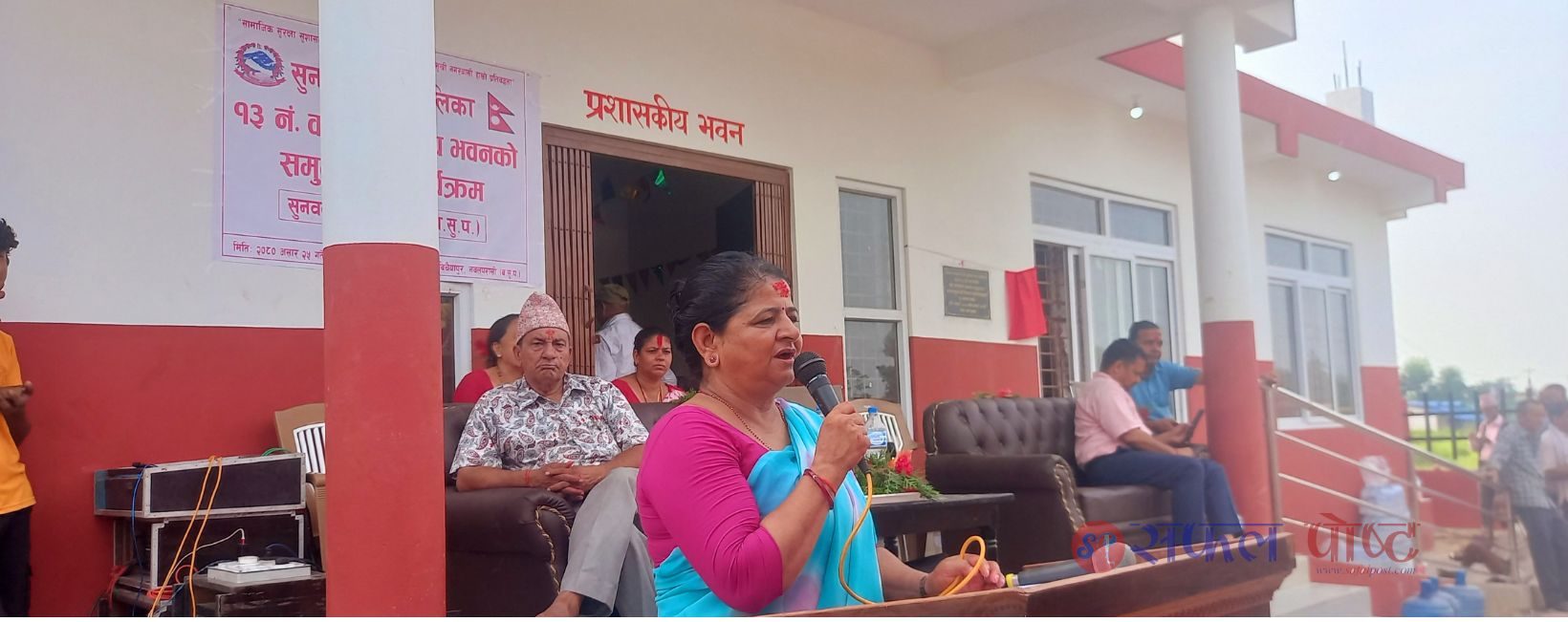 सुनवल नगर प्रवक्ता एव वडा नम्बर-१३ का वडा अध्यक्ष कृष्ण प्रसाद बगालेको अध्यक्षता एवं नगरप्रमुख बिमला अर्यालको प्रमुख आतिथ्यतामा नवनिर्मित भवनको समुद्घाटन कार्यक्रममा बोल्दै नगर प्रमुख अर्यालले नगर प्रमुख अर्यालले स्वास्थ्य,शिक्षा र कृषिलाई प्राथमिकता दिएर अगाडि बढेको बताइन।